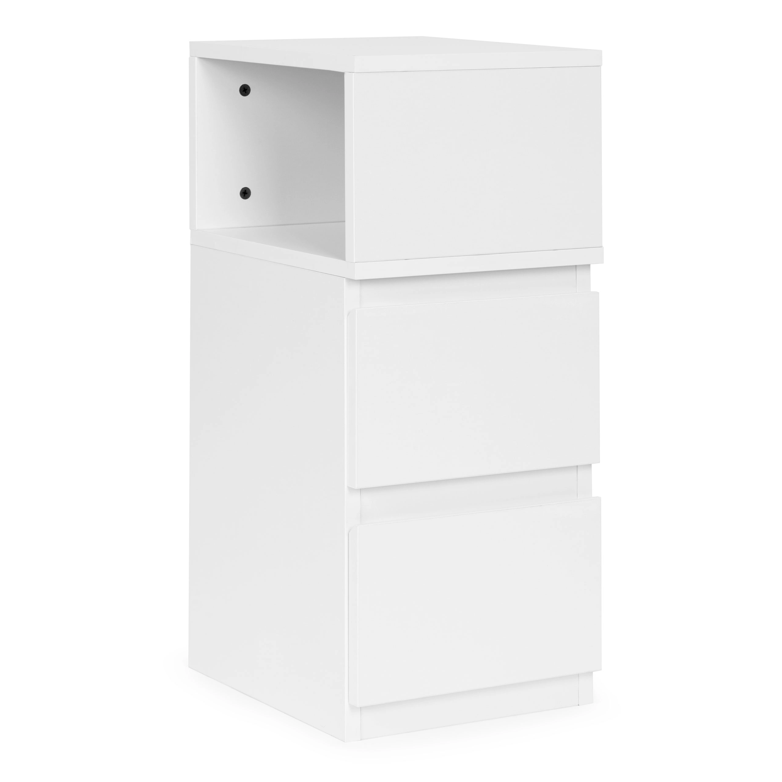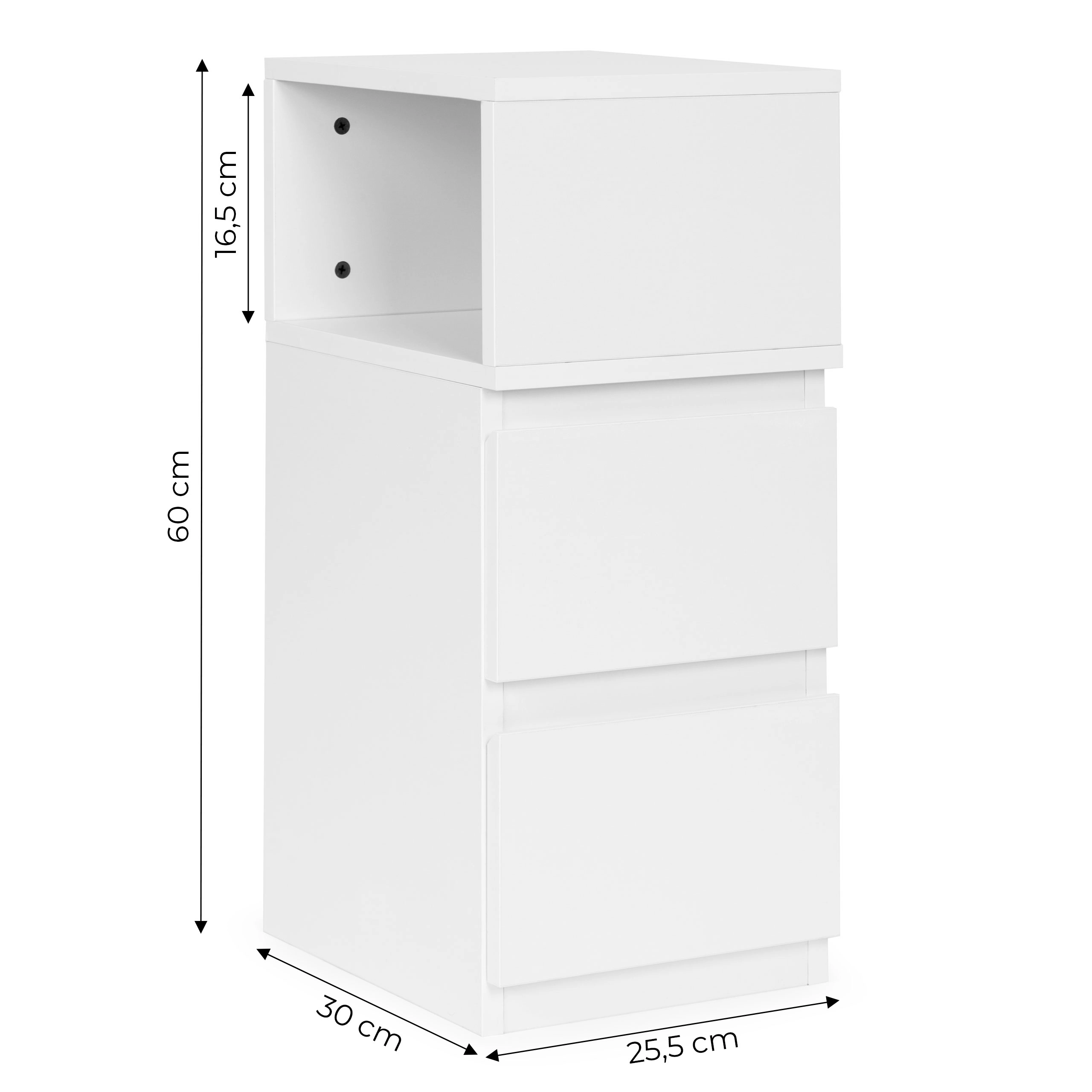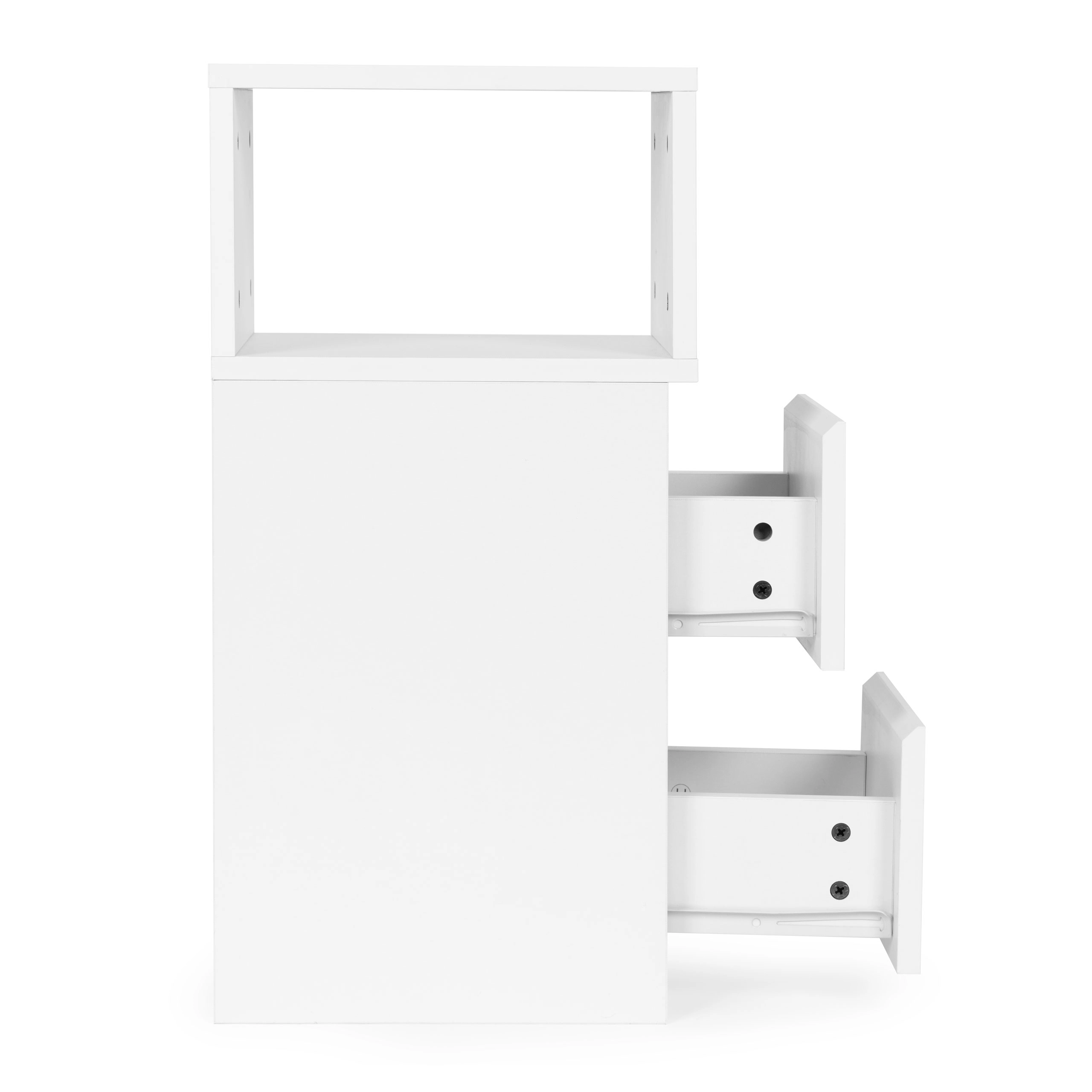 Premišljena shranjevalna rešitev vključuje 2 prostorna predala za drobnarije in odprto polico za stvari, ki jih želite imeti pri roki. Omarica je izdelana iz odpornega MDF, zato je stabilna in zanesljiva tudi pri vsakodnevni uporabi. Minimalistična, kompaktna zasnova se zlahka poda tako v moderne kot tudi manjše interierje.