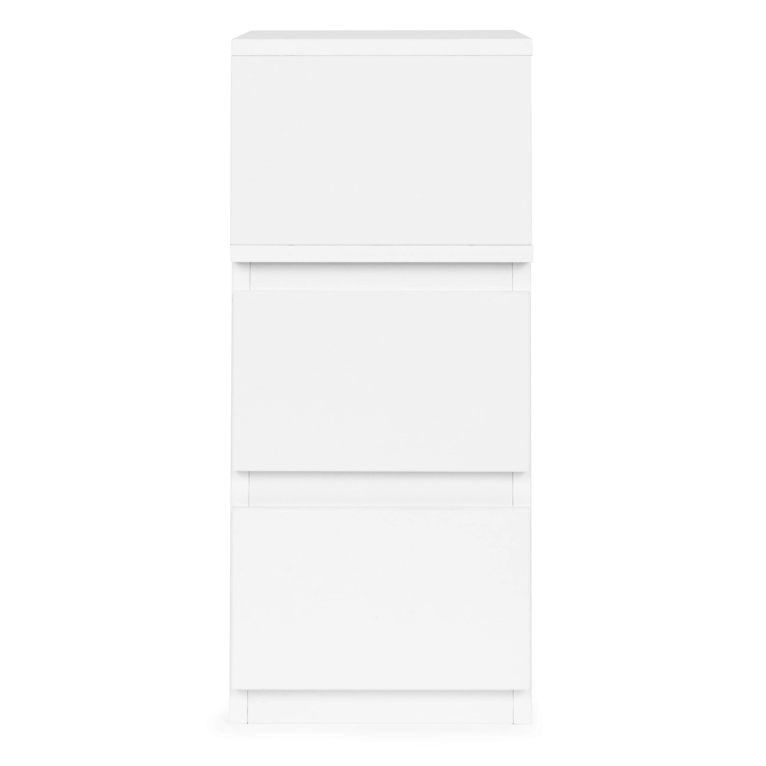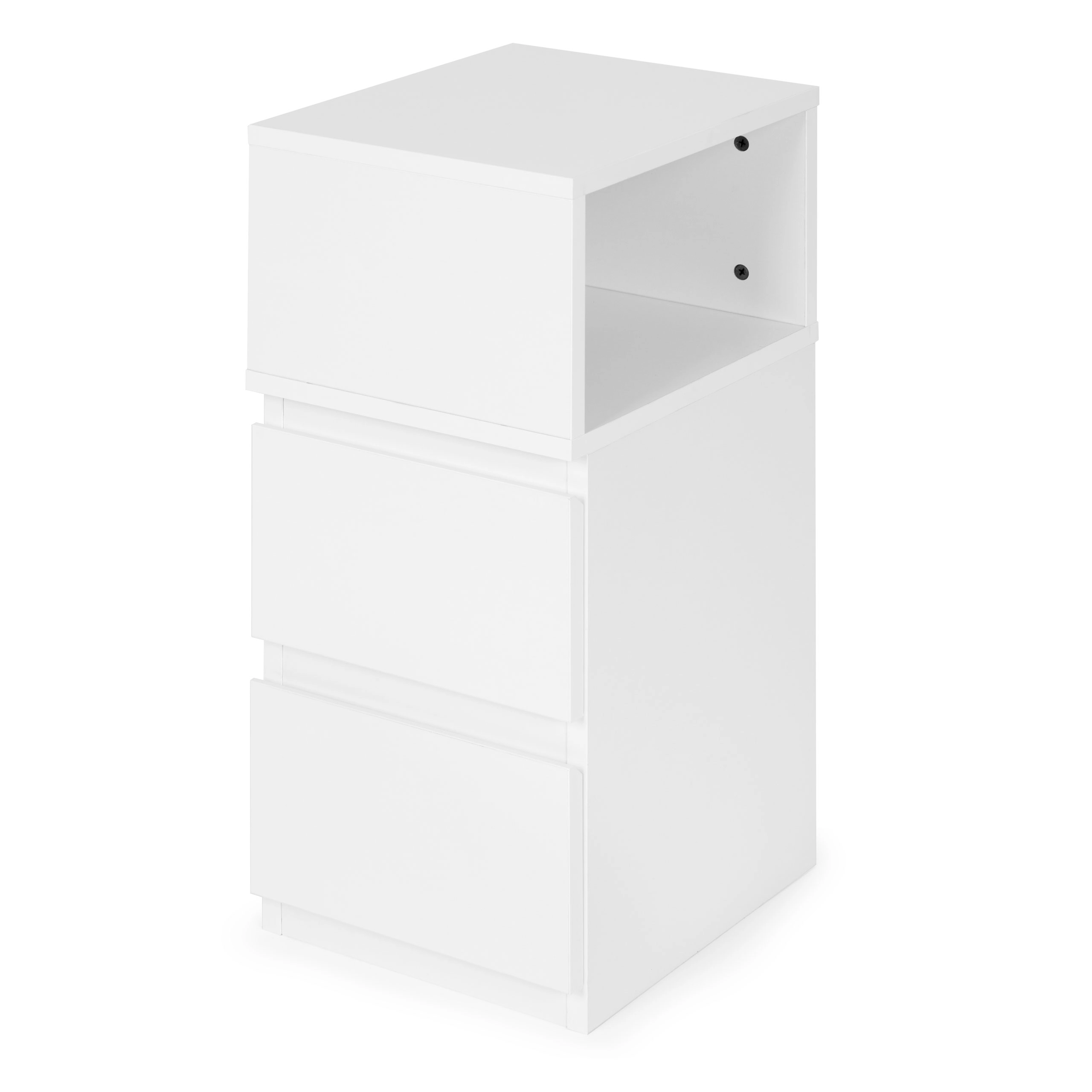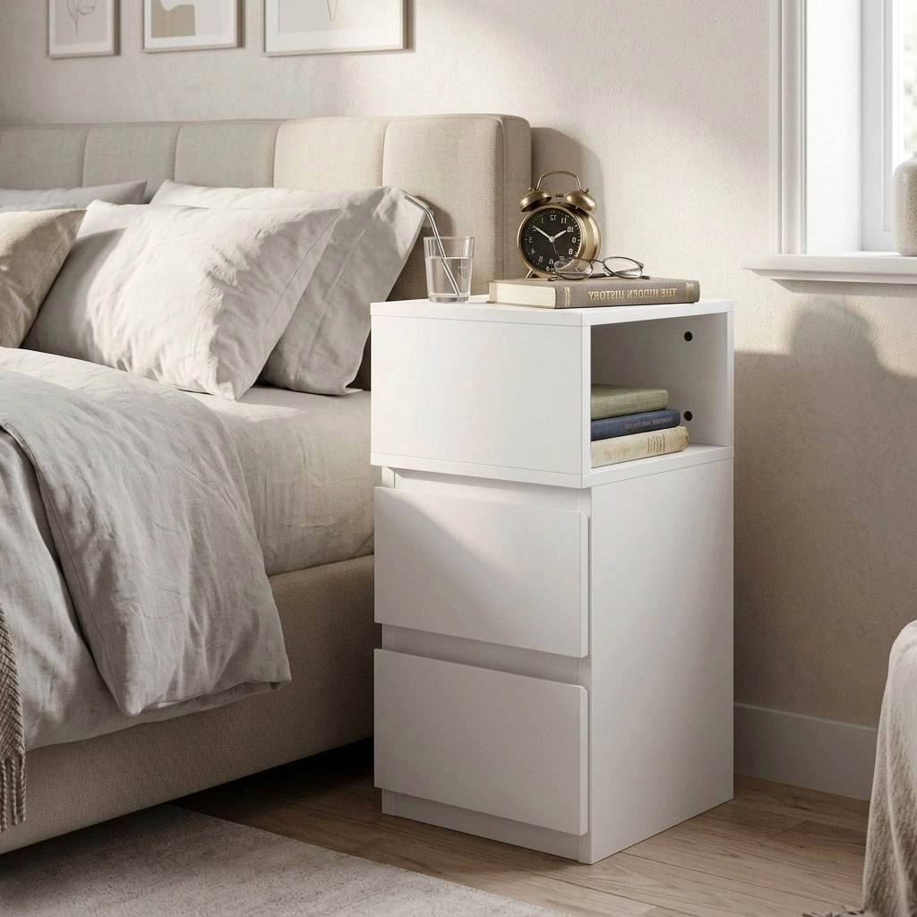 Premišljena shranjevalna rešitev vključuje 2 prostorna predala za drobnarije in odprto polico za stvari, ki jih želite imeti pri roki. Omarica je izdelana iz odpornega MDF, zato je stabilna in zanesljiva tudi pri vsakodnevni uporabi. Minimalistična, kompaktna zasnova se zlahka poda tako v moderne kot tudi manjše interierje.