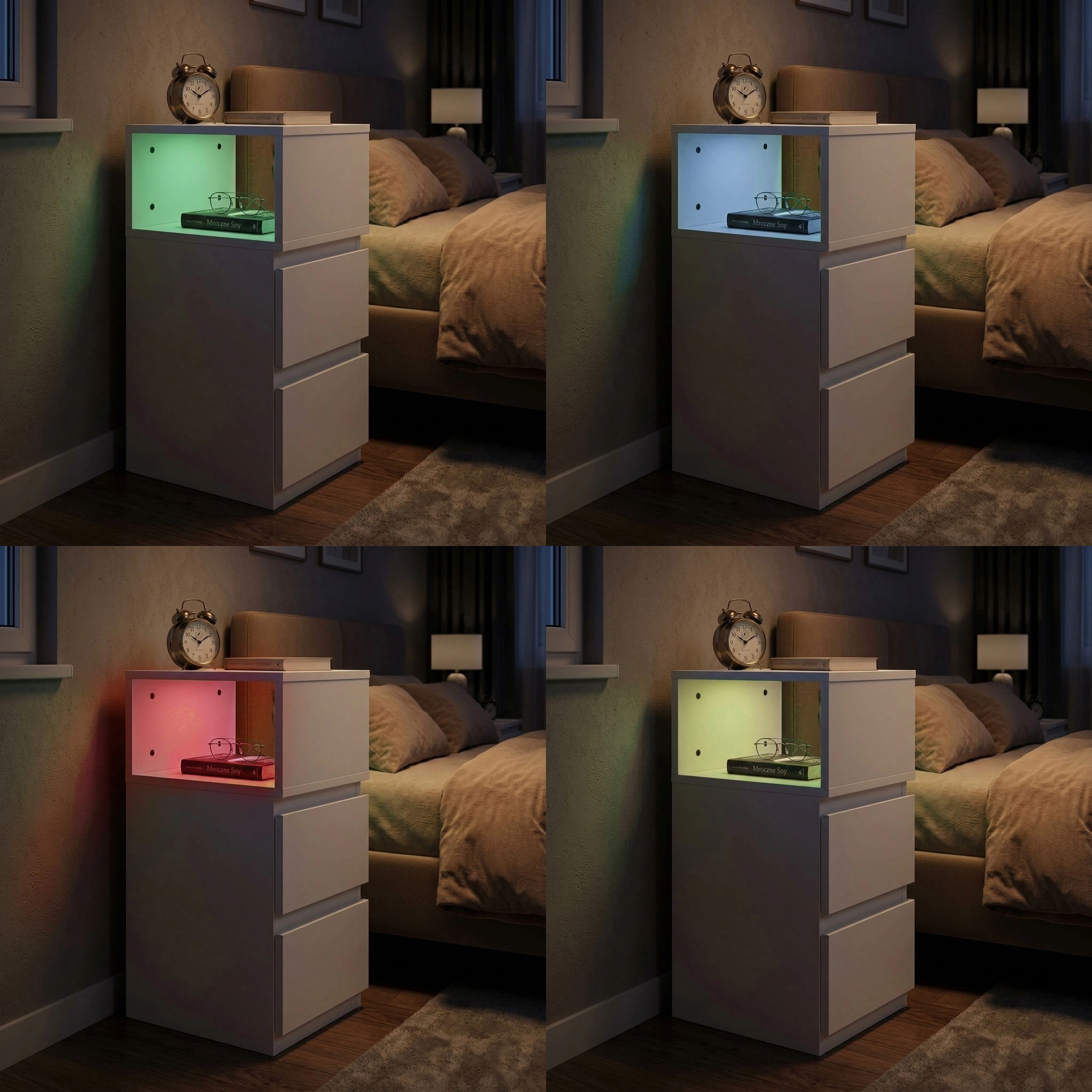 Ustvarite prijetno vzdušje v spalnici s stilsko nočno omarico ModernHome. Vgrajena RGB LED osvetlitev v odprtem predalčku pričara mir za branje in večerni počitek. Upravljanje je preprosto – z daljinskim upravljalnikom izberete med 16 barvami in učinki (Flash, Strobe, Fade, Smooth), medtem ko mobilna aplikacija ponuja še širšo paleto in tekočo nastavitev svetlosti.