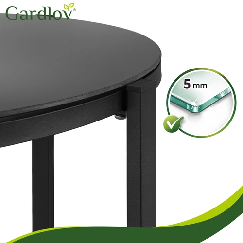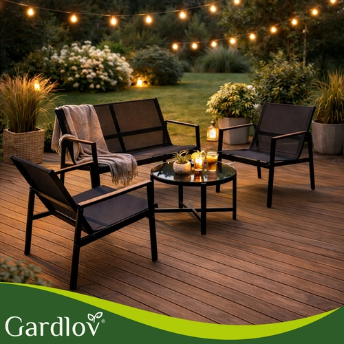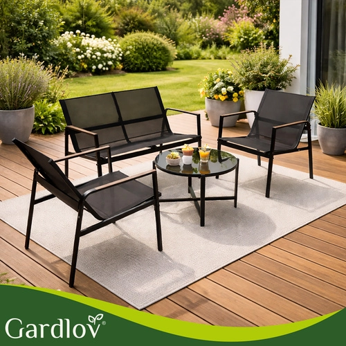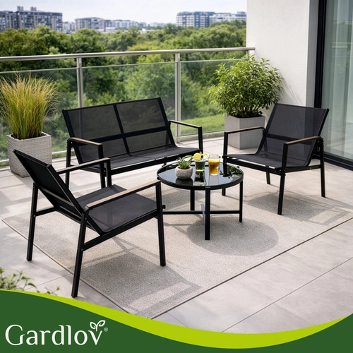 Ustvarite prijetno cono na balkonu ali terasi v hipu. Set GARDLOV 4 v 1 vključuje zofo, dva naslanjača in klubsko mizico z kaljenim steklenim pultom. Zahvaljujoč jekleni (pocinkani) konstrukciji in zračni tkanini teslin je komplet stabilen, vremensko odporen in enostaven za vzdrževanje – dovolj je obris z vlažno krpo.