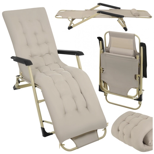 Ležalnik 3v1 združuje funkcijo stola, ležalnika in počivalnika, zato si lahko vedno nastavite idealen položaj za branje, sončenje ali popoldanski počitek. Tristopenjska nastavitev naslonjala in podnožnika razbremeni hrbet in kolena, medtem ko debela blazina z 1,2 kg polnila nudi mehko oporo po celotni dolžini telesa.