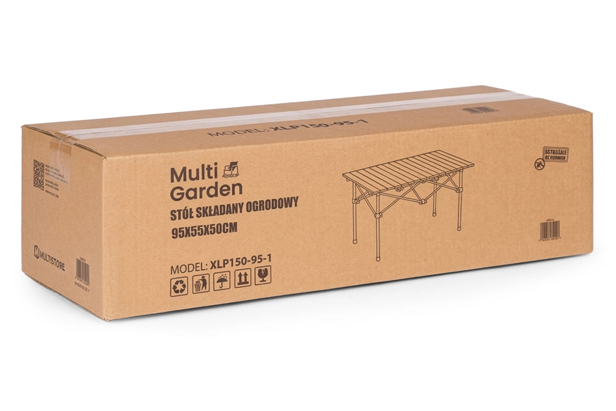 Miza ima rolano namizno ploščo iz lamel, ki ustvari stabilno površino za postrežbo in pripravo. Trden okvir iz ogljičnega jekla s križnim ojačanjem zagotavlja stabilnost, nedrseče kapice pa trdno stojijo na travi, terasi in zemlji. Montaža je intuitivna in povsem brez orodja – dovolj je, da razprete okvir in ploščo pripnete z zaklepnimi sponkami.