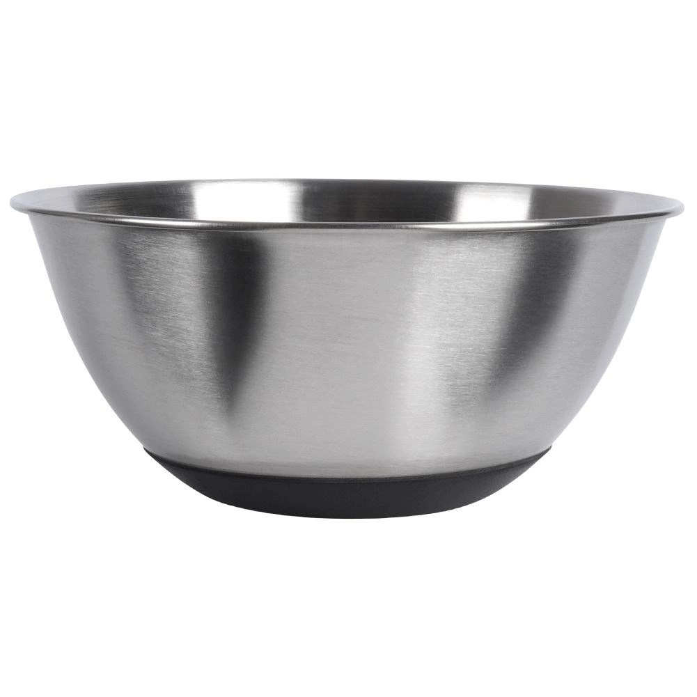 Ta vsestranska nerjaveča skleda združuje praktične mere z visoko odpornostjo in zanesljivostjo pri uporabi. Protizdrsno dno v črni barvi preprečuje drsenje po delovni površini, zato lahko udobno mešate, stepate in gnetete. Eleganten mat videz in klasična oblika jo naredita tudi privlačno skledo za neposredno postrežbo na mizi.