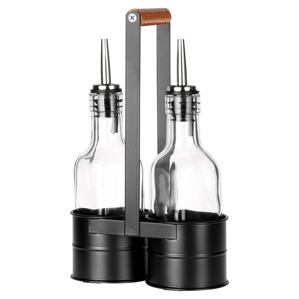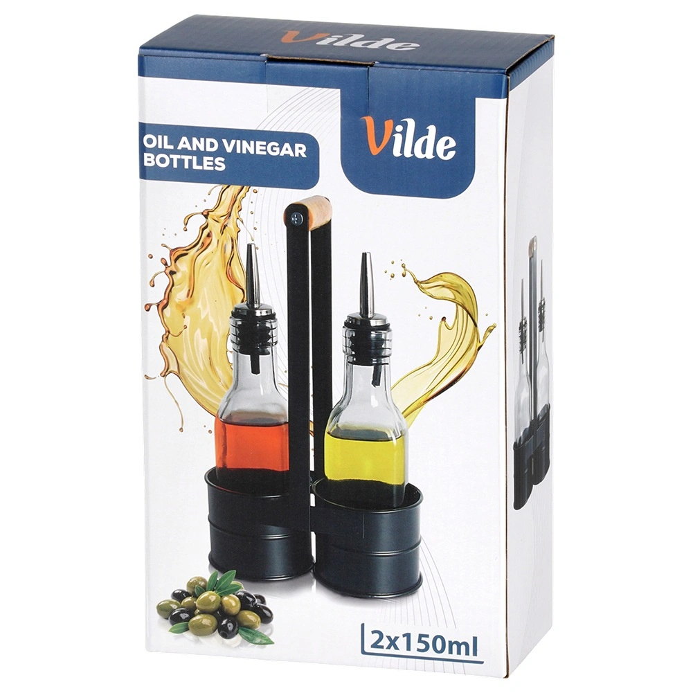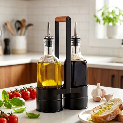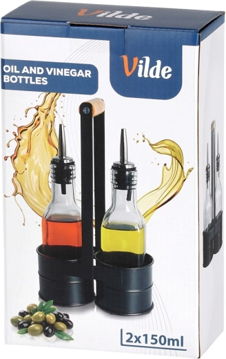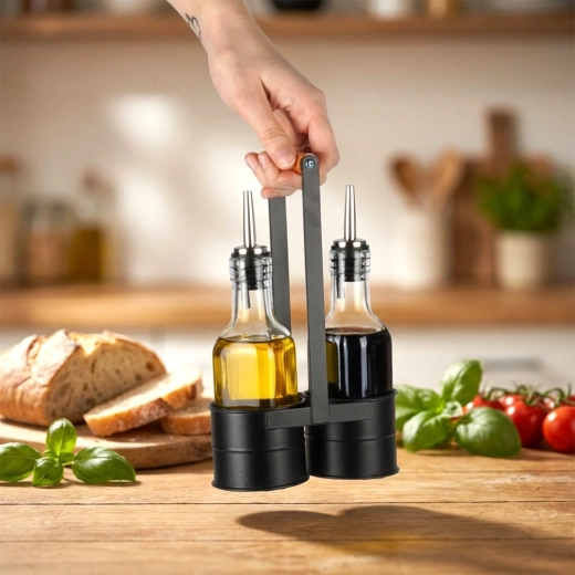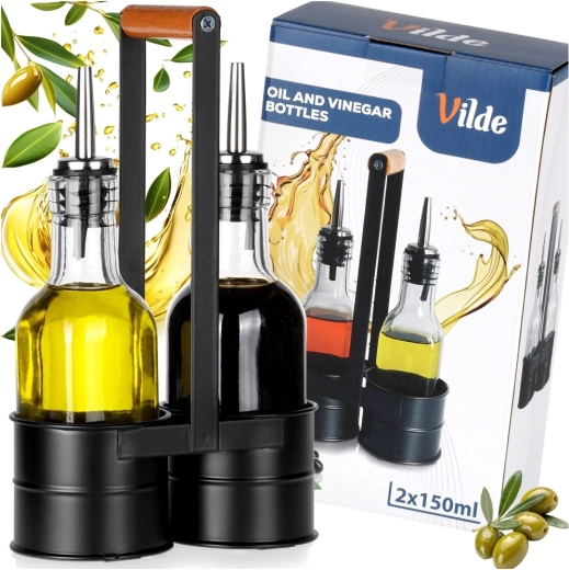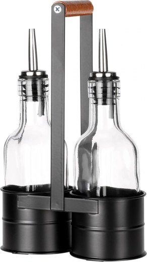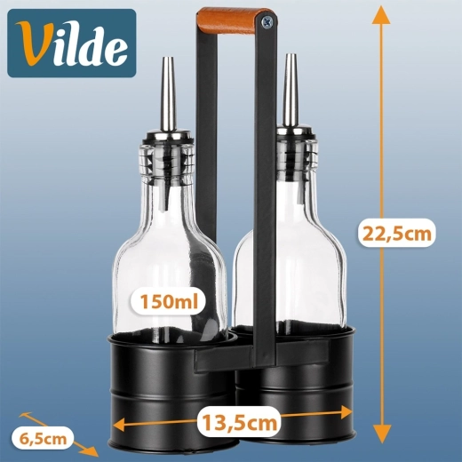 Praktičen komplet dveh steklenih steklenic za olje in kis v stabilnem kovinskem stojalu z lesenim ročajem. Vsaka steklenica ima prostornino 150 ml in je opremljena z nerjavečim nalivnim zapiralom za natančno in čisto doziranje. Prosojno steklo omogoča takojšen nadzor vsebine, eleganten črn stojalo pa zagotavlja lahko prenašanje in urejeno serviranje za mizo.