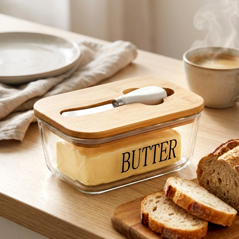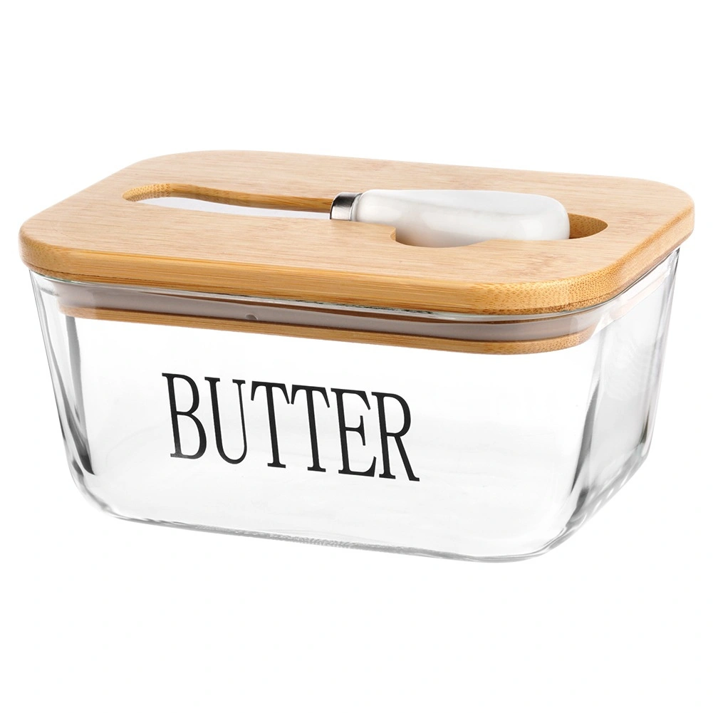 Čisto steklo z napisom BUTTER in naravni bambus tvorita eleganten dodatek za mizo in hladilnik. Klasična oblika se poda vsaki kuhinji.