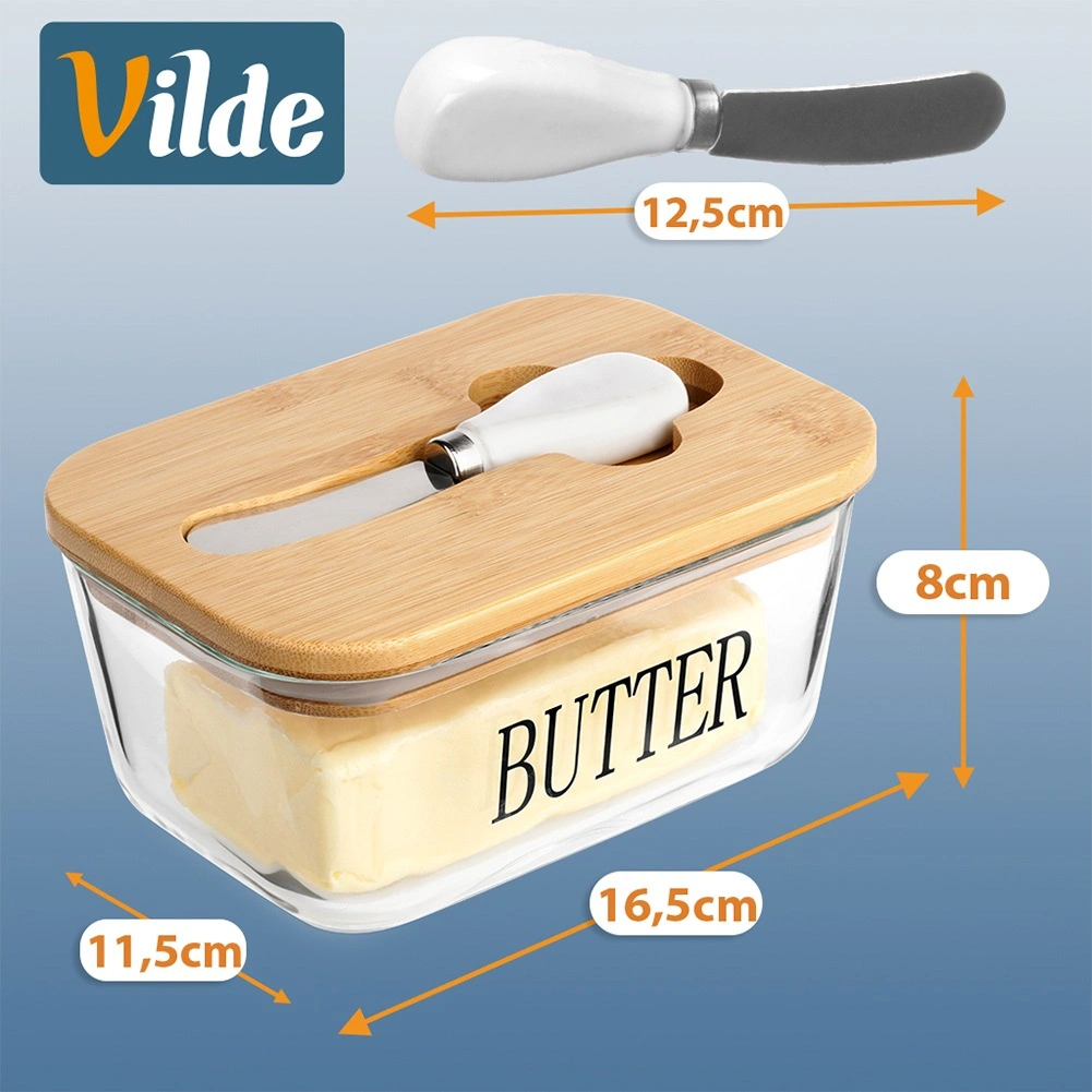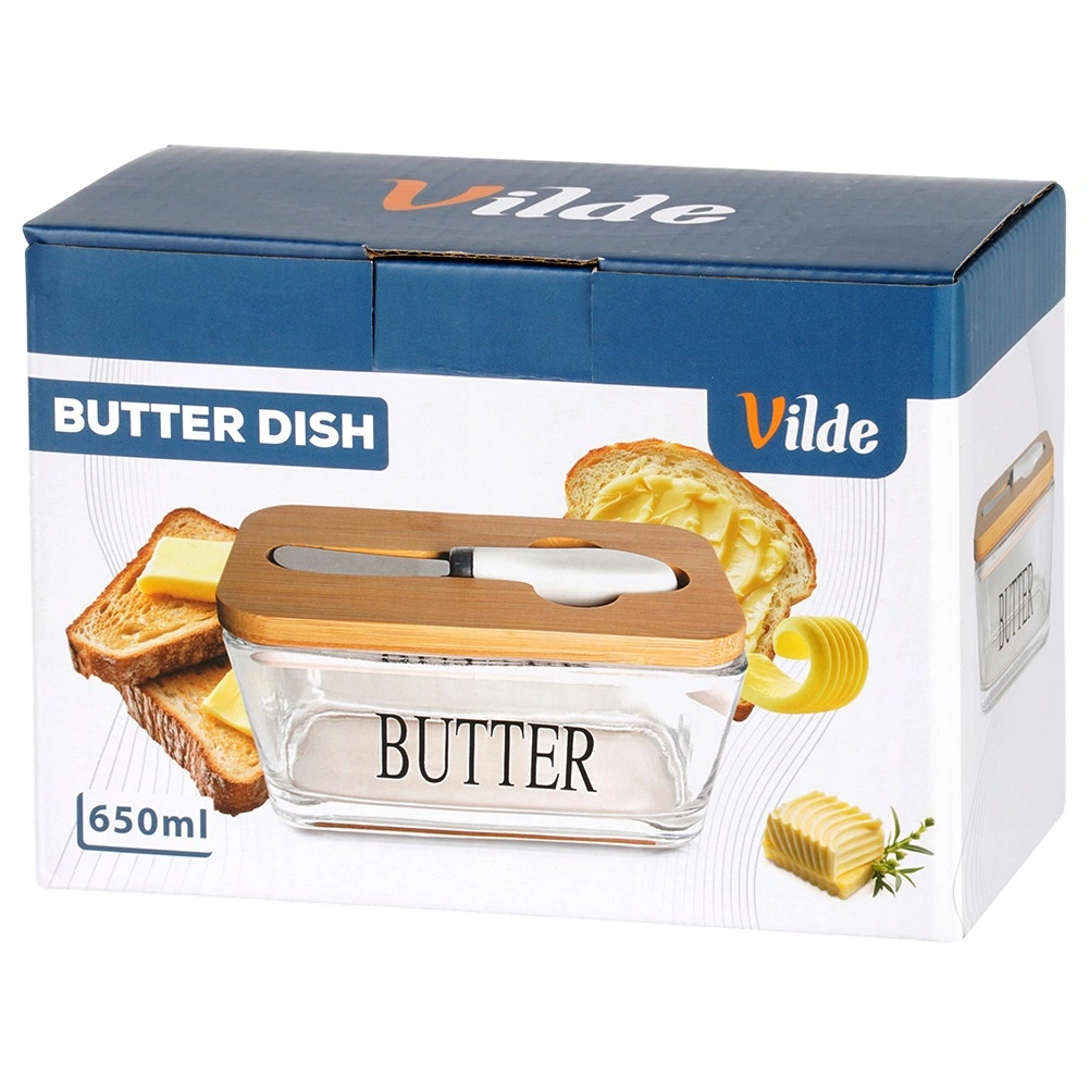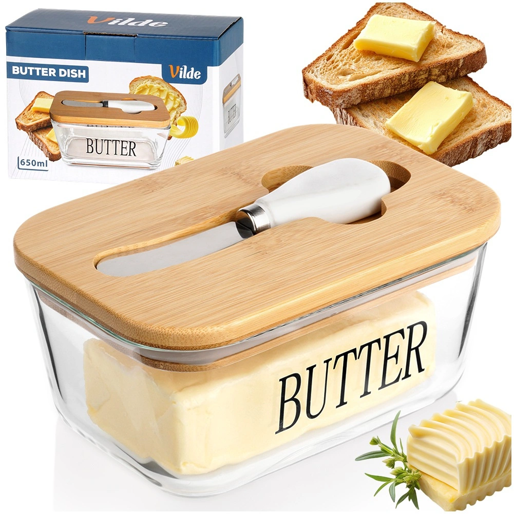 Elegantna steklena posodica za maslo z bambusovim pokrovom in vgrajenim nožkom za maslo za udobno shranjevanje in postrežbo. Prosojno steklo z napisom BUTTER, prostornina 650 ml, mere 16,5 × 11,5 × 8 cm. Stekleni del je mogoče pomivati v pomivalnem stroju in je primeren za mikrovalovno pečico. Stilski dodatek za vsako kuhinjo.