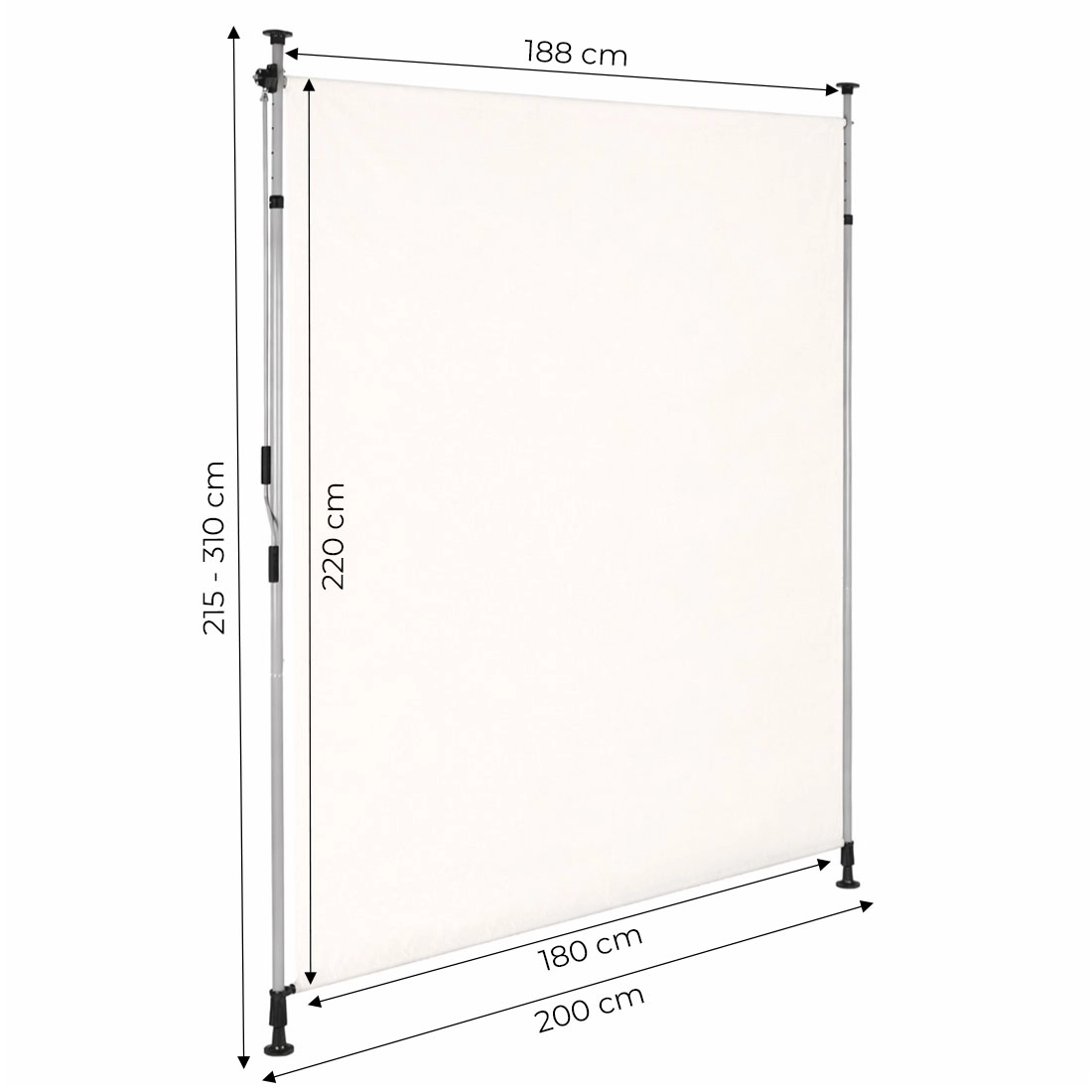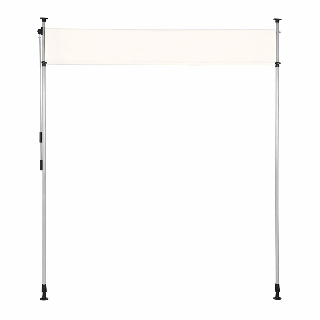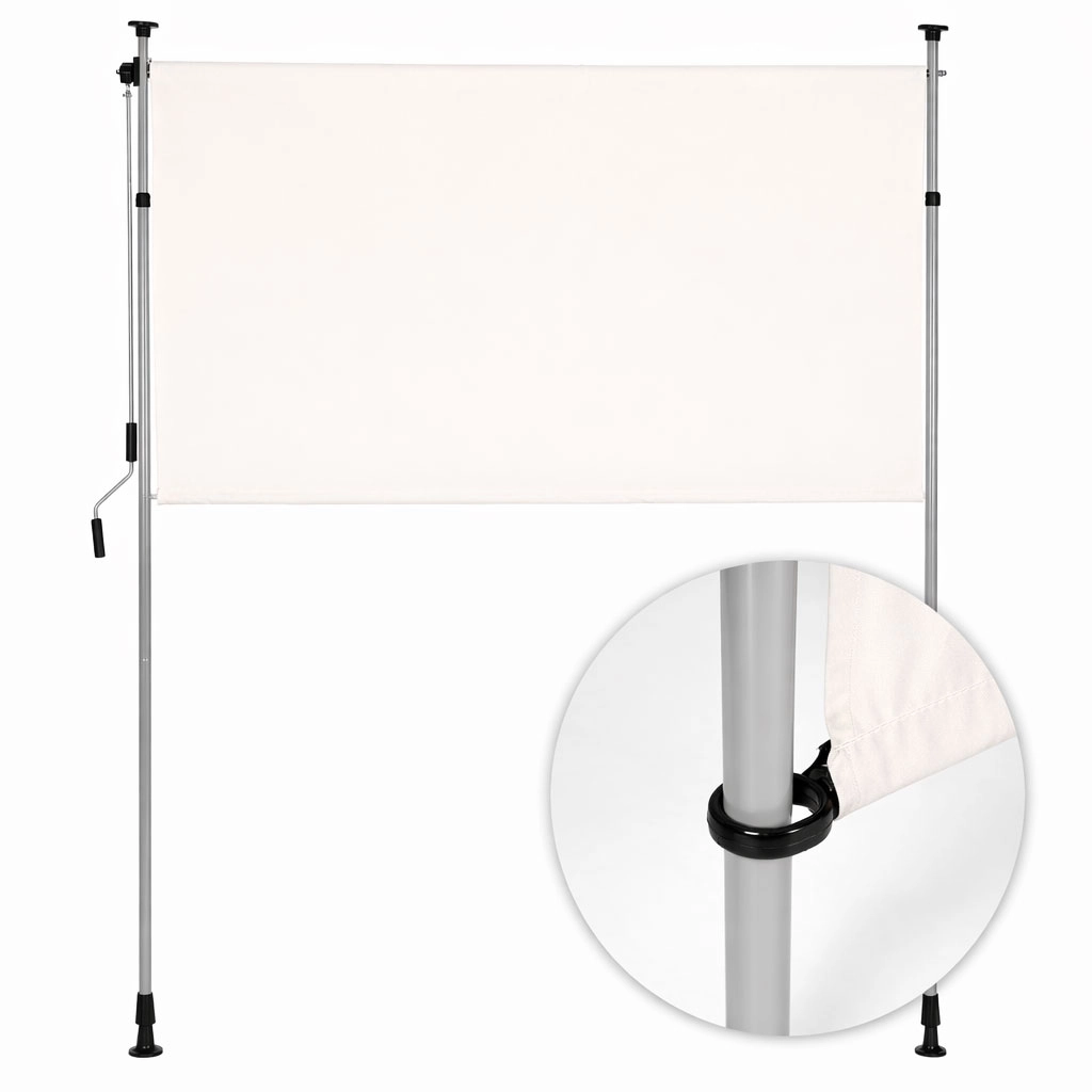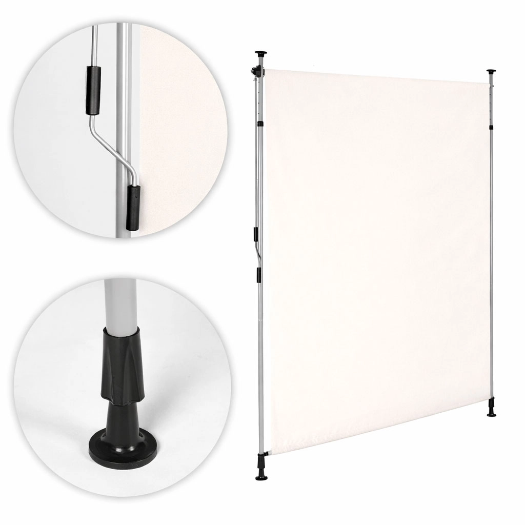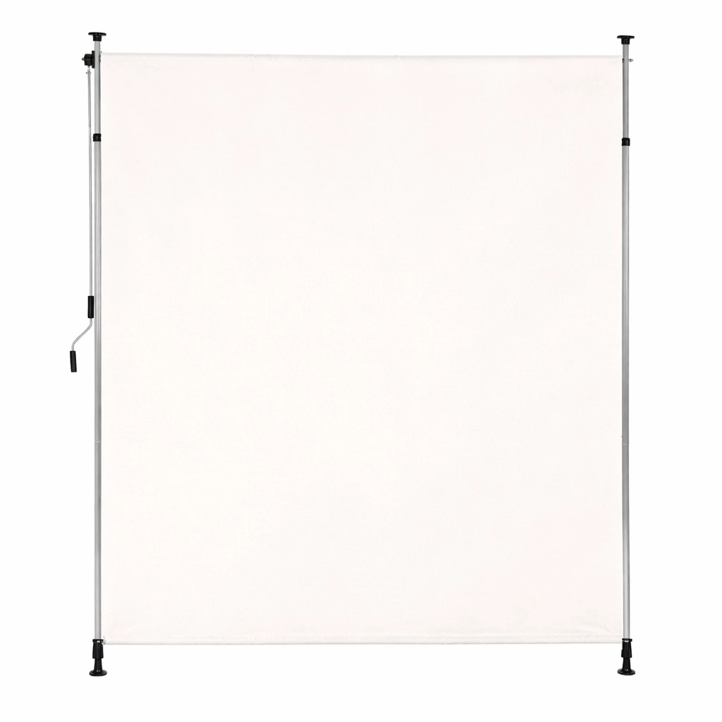 Robusten jeklen okvir s prašnim premazom kljubuje vremenskim vplivom, medtem ko kakovostna poliestrska tkanina 180 g/m² s hidrofobno obdelavo ščiti pred soncem in rahlim dežjem. UV-odpornost zagotavlja dolgo obstojnost barve in materiala, nedrseče končnike pa držijo rolo varno med tlemi in stropom.