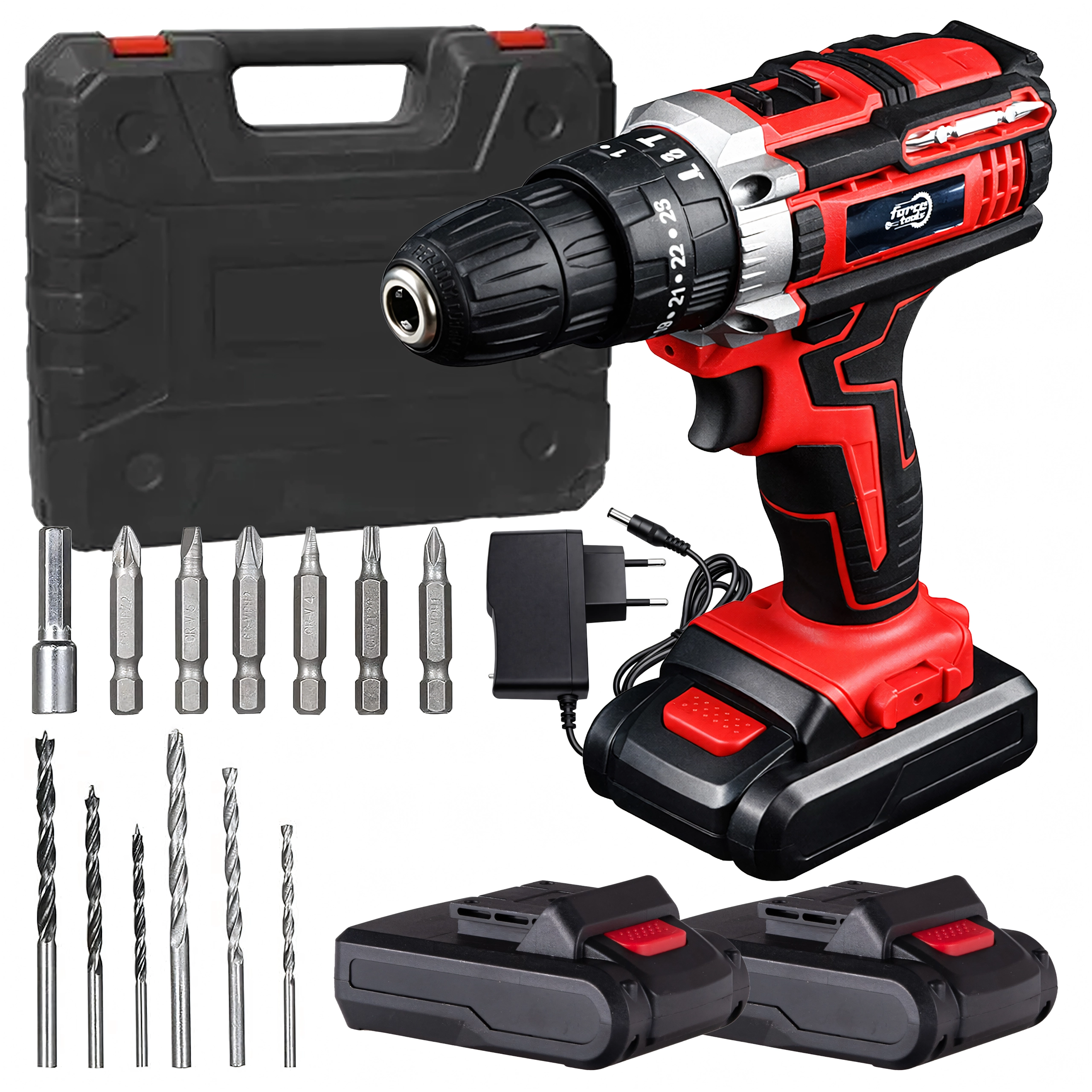 Prejmete dve bateriji, polnilnik, bite in svedre v čvrstem kovčku. Vse potrebno pri roki za hiter začetek na katerem koli projektu.