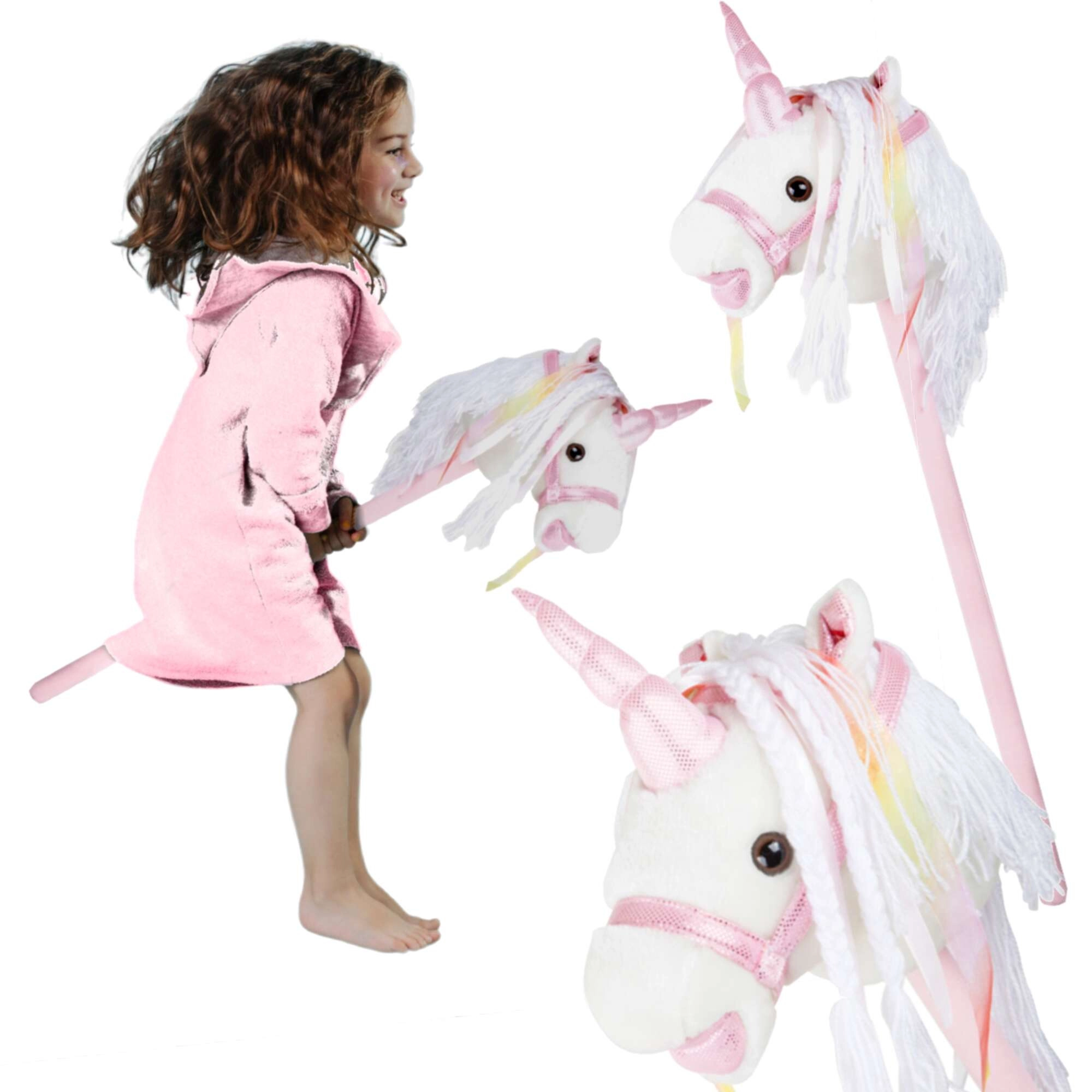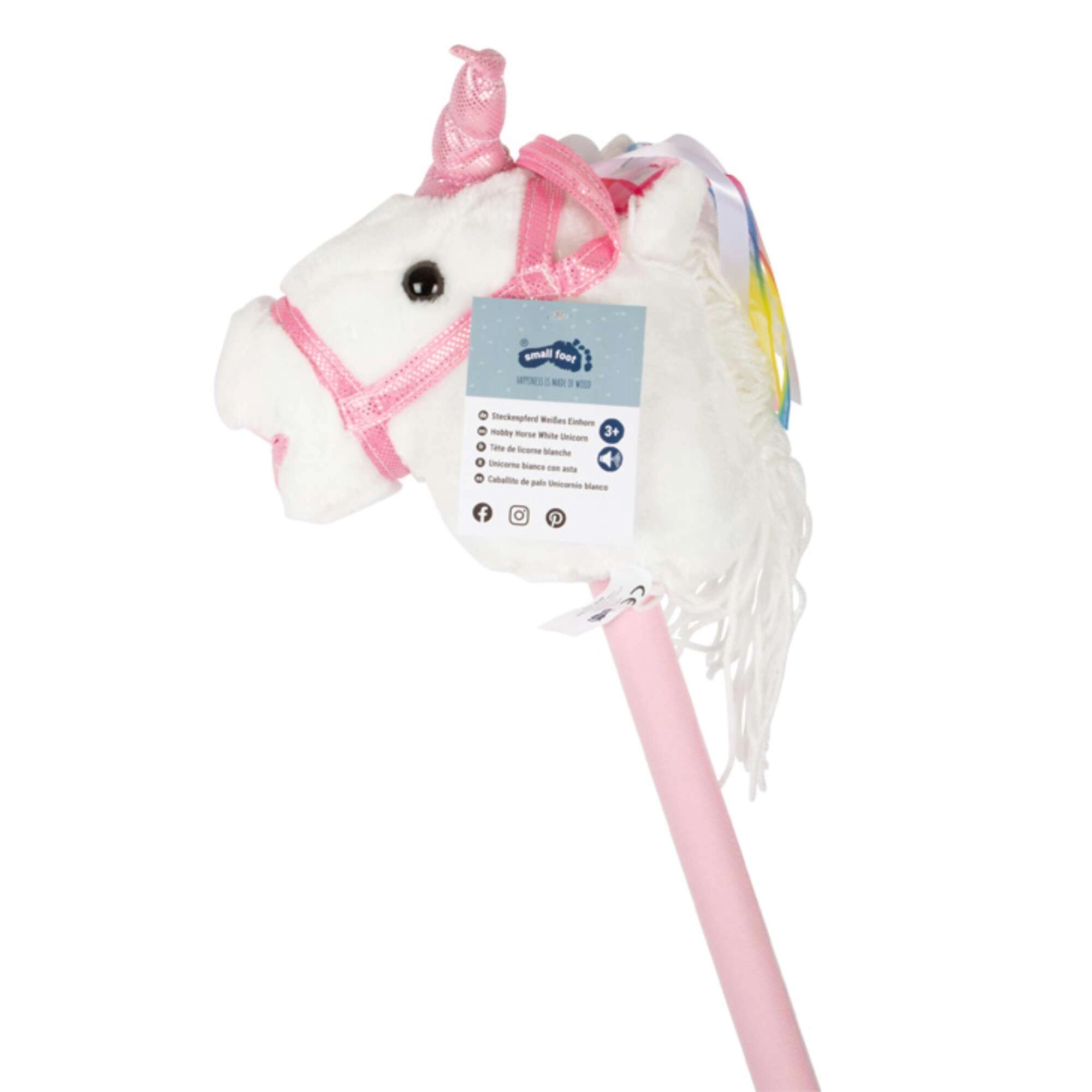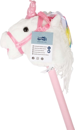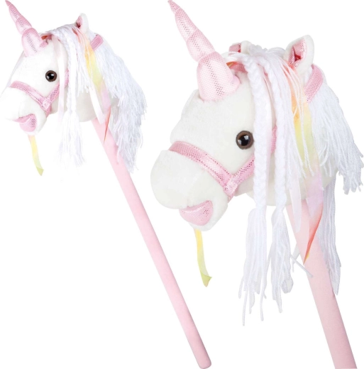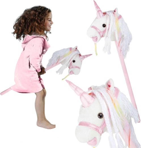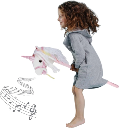 Ta samorog na palici spodbuja gibanje, domišljijo in igranje vlog. Nežen pliš je prijeten na otip, okrasna griva in trakovi pa vsaki ježi dodajo čarobno vzdušje. Po pritisku na gumb v ušesu se oglasijo realistični zvoki kasa in rezgetanja, ki otrokom še bolj oživijo igro jahanja.