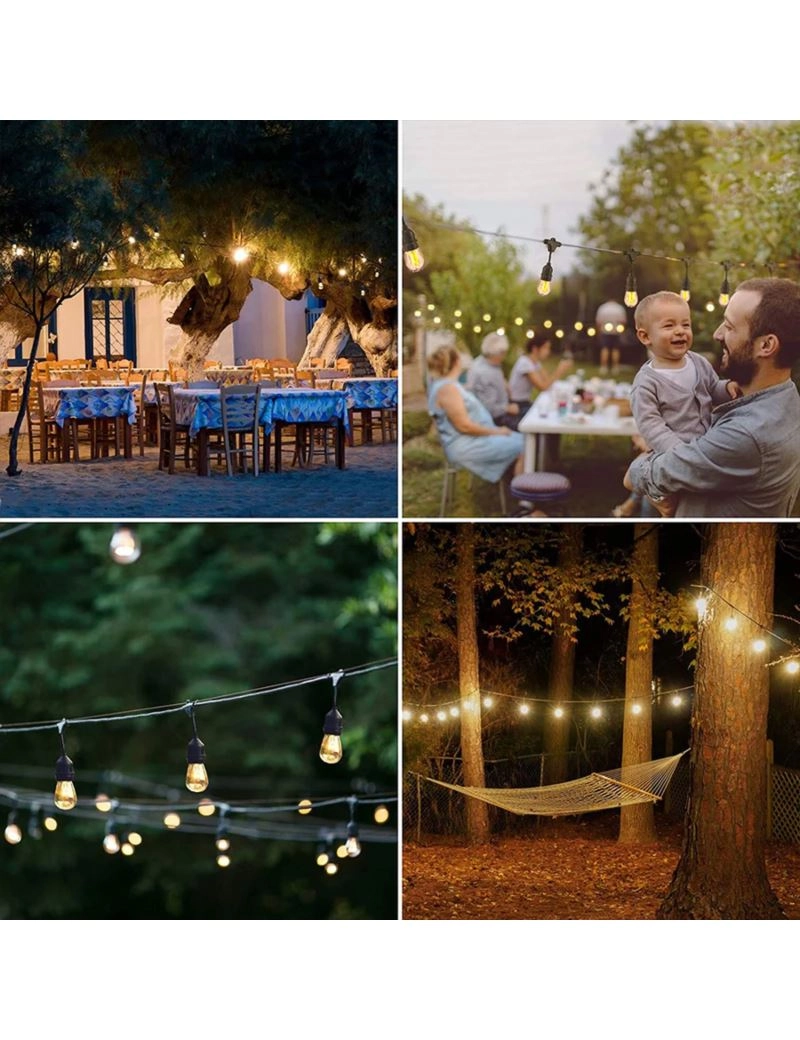 Praktična zasnova z zamenljivimi LED žarnicami E27 in vzdržljivimi, nelomljivimi senčniki zagotavlja varnost in brezskrbno uporabo na prostem in v notranjosti. Robustni kabel olajša montažo ob ograji, preko pergole ali med drevesi, zaščita IP44 pa zanesljivo kljubuje dežju in vlagi.