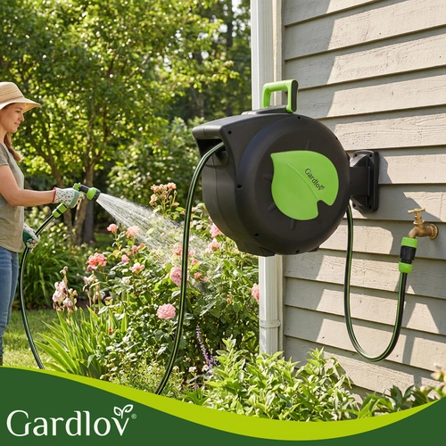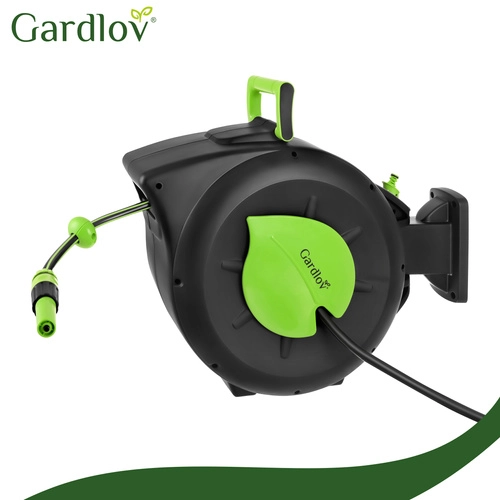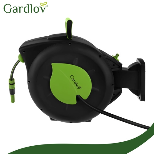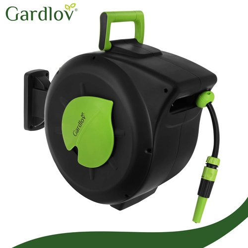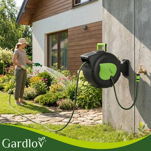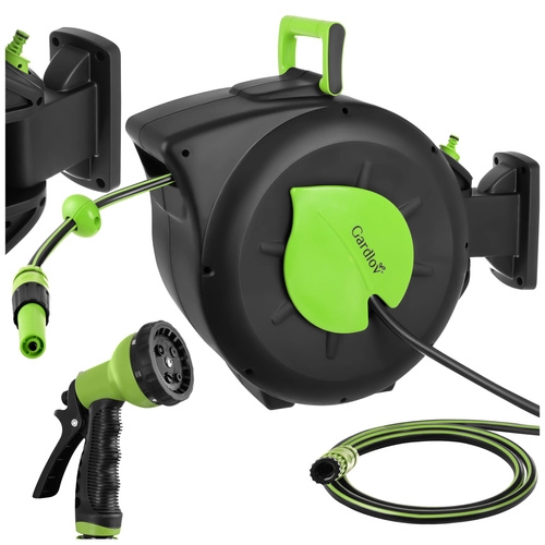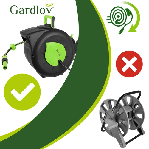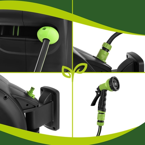 Praktična rešitev za vsak vrt: samodejni navijalni mehanizem prihrani čas, preprečuje zvijanje in ščiti cev. Z dosegom 30 m boste udobno zalili oddaljene gredice brez preklapljanja, medtem ko blokada dolžine drži cev natančno v želenem položaju.