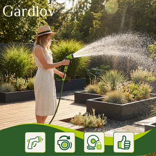 Stenski nosilec z 180° vrtljivim sklepom omogoča tekoče gibanje po dvorišču brez pregibanja. 7-stopenjska pršilna pištola nudi vse od nežne megle do močnega curka za čistilna opravila. Združljivost s pipami 1/2" in 3/4" zagotavlja enostavno priključitev v običajnih hišnih instalacijah; delovanje je stabilno pri tlaku do 6 bar.