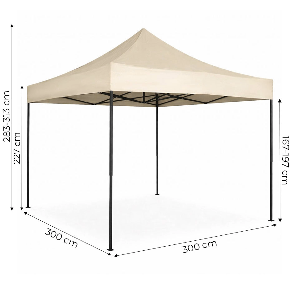 Praktičen vrtni paviljon z merami 3×3 m za hitro ustvarjanje sence in zavetja pri žarih, praznovanjih in poslovnih dogodkih. Zahvaljujoč samodejno zložljivemu jeklenemu ogrodju ga postavite v trenutku. 4-stopenjska nastavitev višine prilagodi prostor vašim potrebam, odporna streha 420D s PVC prevleko pa ščiti pred soncem in rahlim dežjem. Priloženi so transportna torba, količki in sidrne vrvi za boljšo stabilnost.