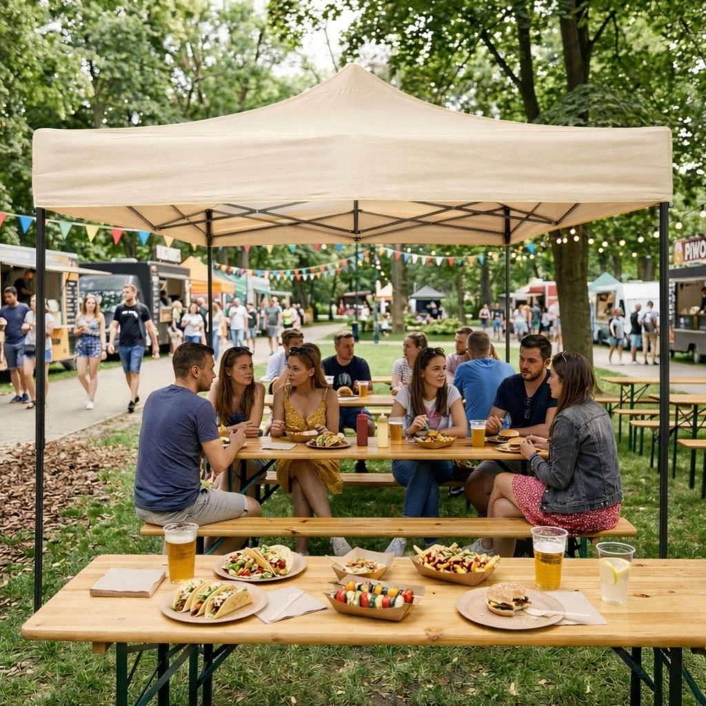 - Vodoodbojna in UV-odporna streha 420D – zanesljiva zaščita za goste in opremo.
