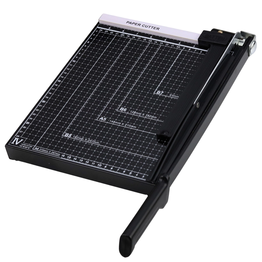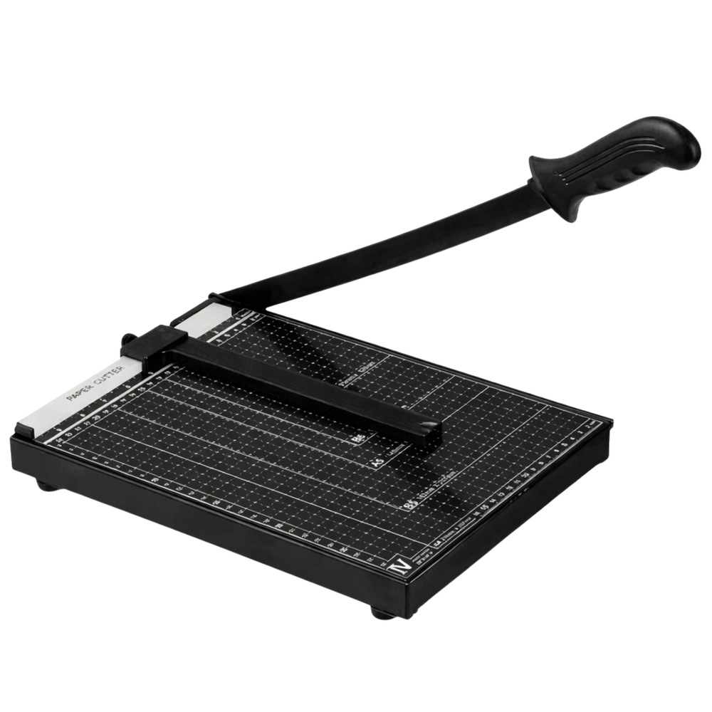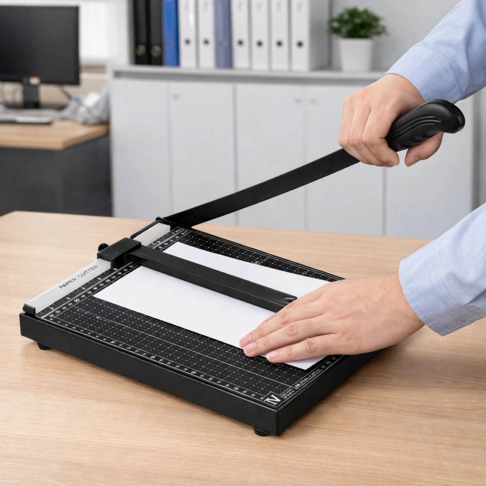 Ta giljotina za papir A4 je idealna za pisarno, šolo, tiskarno in domačo delavnico. Stabilno ogrodje z merilnimi črtami in oznakami formatov pomaga natančno nastaviti dokument pred rezom. Kovinsko rezalno ročico z dolgim ročajem omogoča čist in raven rez brez velikega napora.