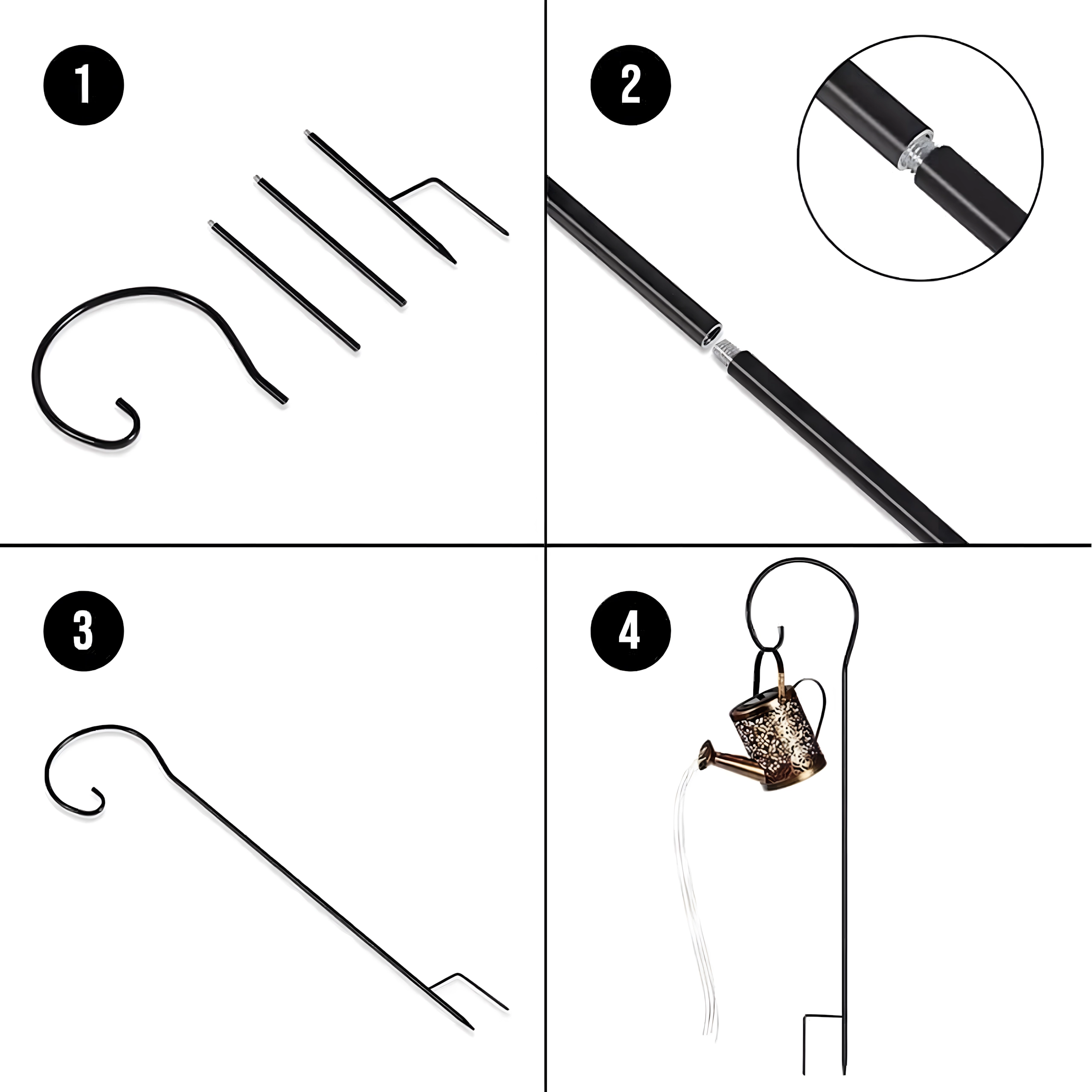 - Obešanje na kavelj (shepherd’s hook) / zabodno stojalo v tla