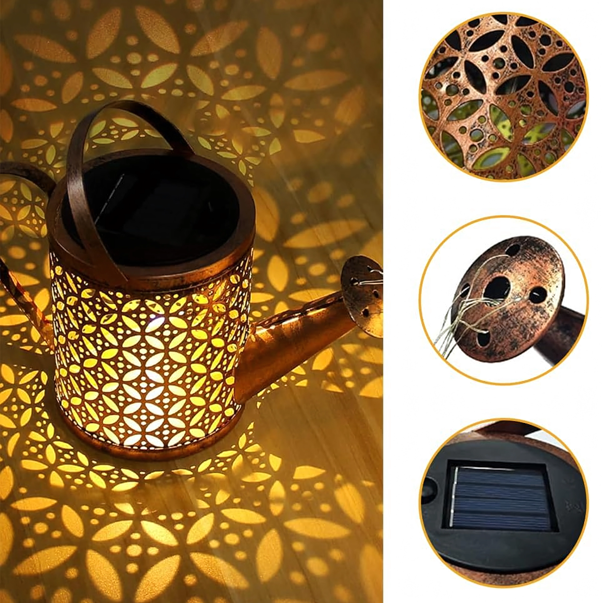 Sončna zalivalka je impresivna vrtna dekoracija, ki čez dan zbira energijo sonca, zvečer pa zasije topla LED svetloba, ki iz izliva priteka kot nežna svetlobna prha. Vzorčasto kovinsko telo ustvarja lepe sence in pričara prijetno vzdušje ob poteh, v gredicah in na terasi.