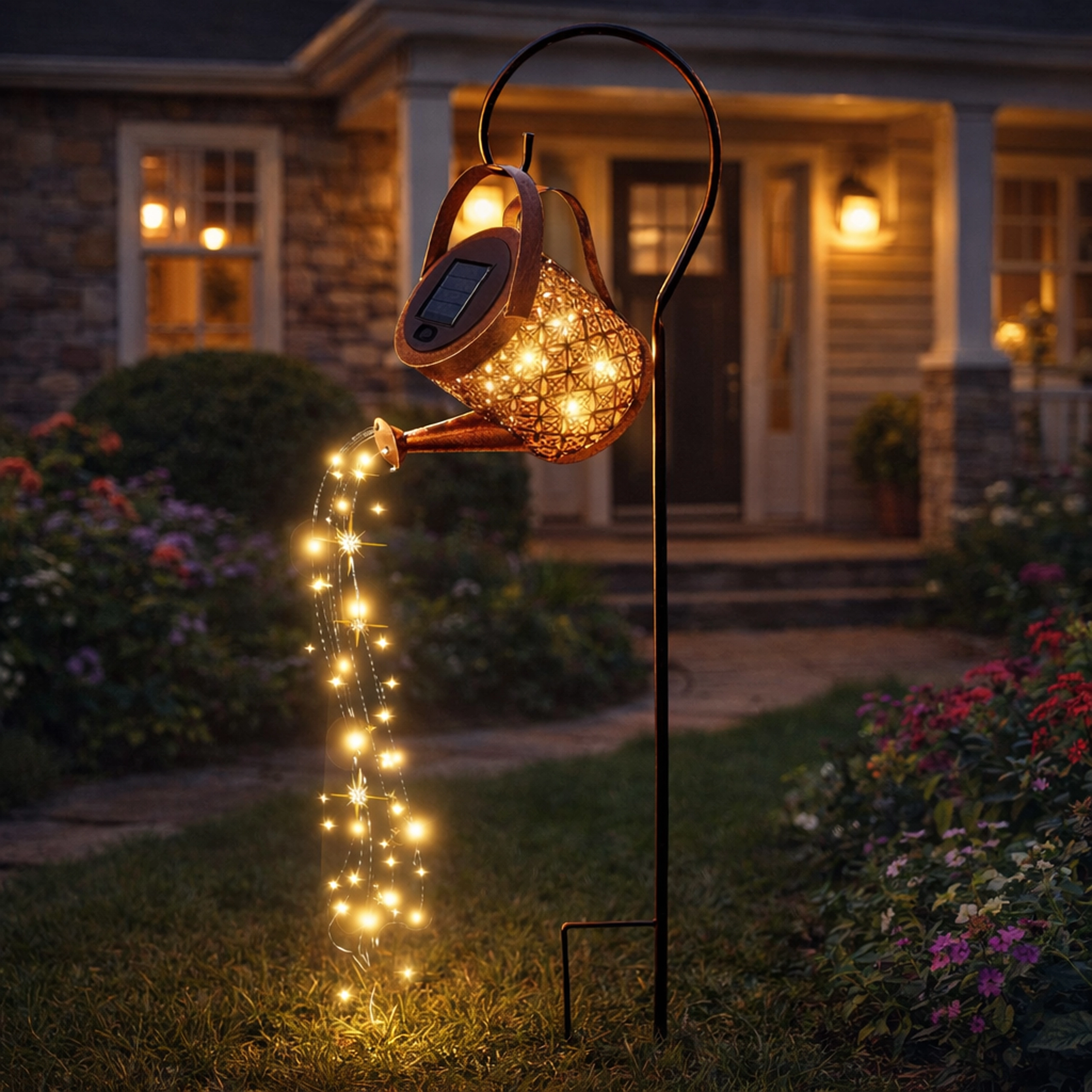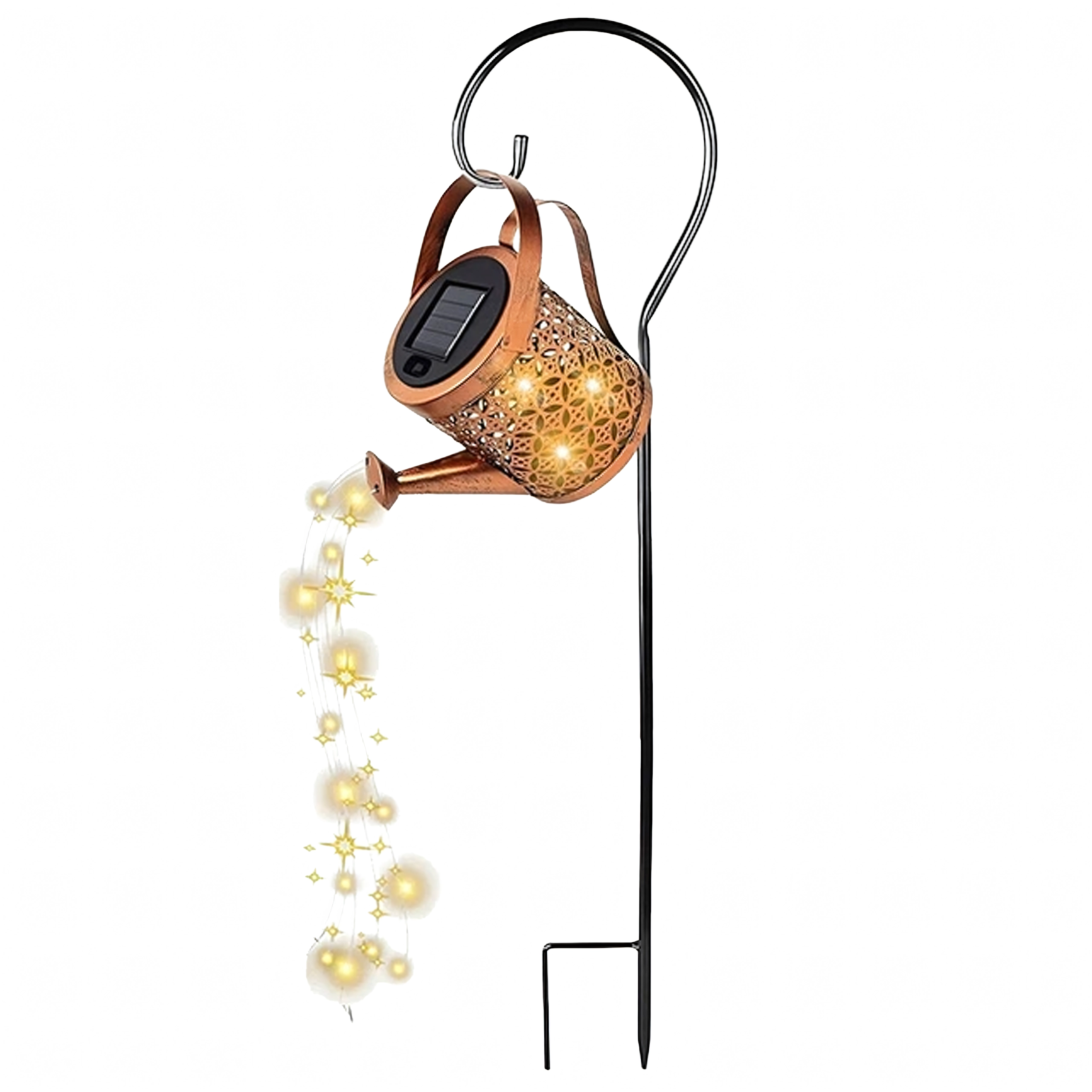Polepšajte vrt, teraso ali balkon z čarobnim učinkom »tekoče vode«. Ta dekorativna sončna svetilka v obliki zalivalke zahvaljujoč toplim LED lučkam ustvari nežno kaskado svetlobe in se po mraku samodejno prižge. Ponuja brezžično sončno delovanje, vzdržljivo kovinsko izvedbo in preprosto namestitev v tla z zabodnim stojalom ali obešanje na kavelj.