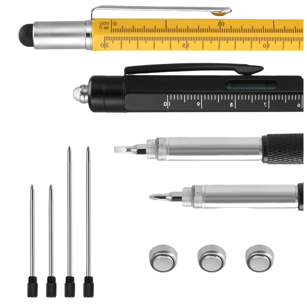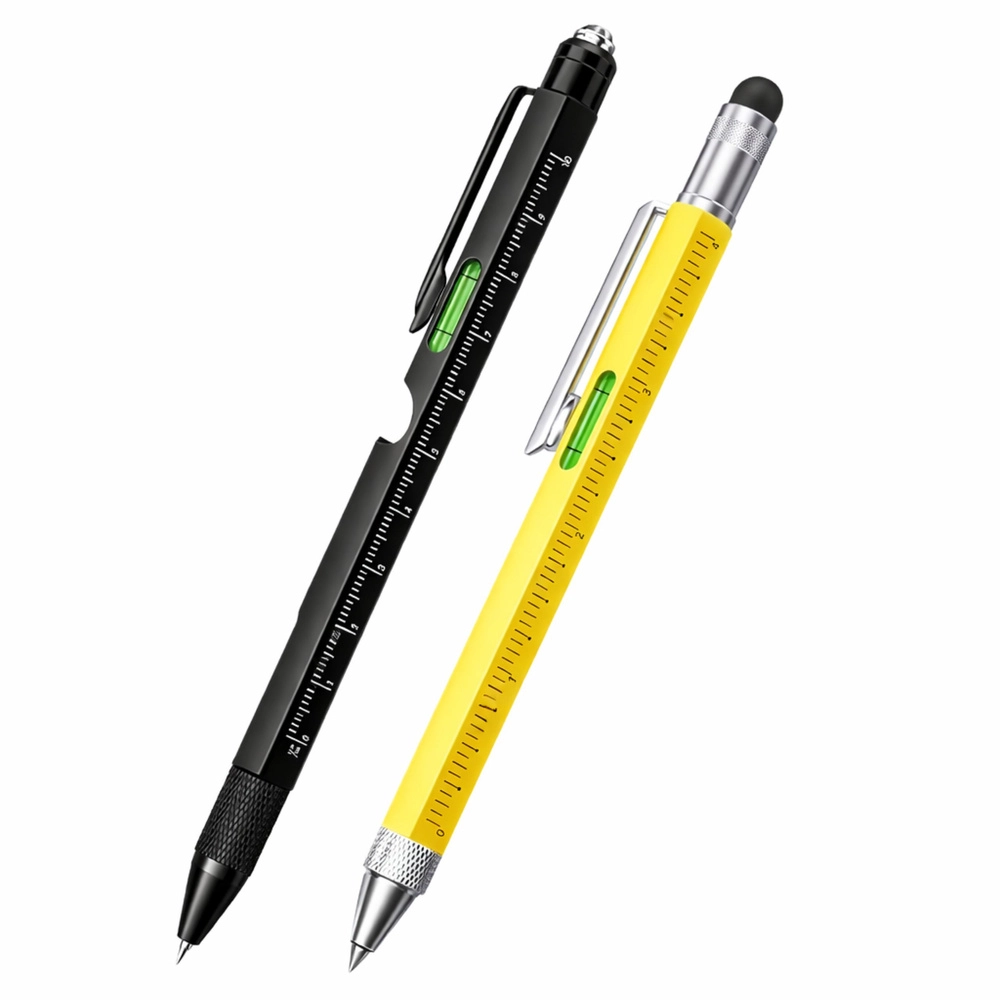 Prihranite prostor in čas z univerzalnim kompletom, ki združuje pisanje, merjenje in hitra manjša popravila. Črni svinčnik 9v1 je opremljen z LED svetilko za delo v slabših razmerah, vgrajeno libelo za poravnavo, natisnjeno merilno lestvico, pisalom za dotik, odpiračem za steklenice, držalom za telefon in parom vijačnih nastavkov (ploščati/križni). Rumeni svinčnik dopolnjuje najpogosteje uporabljene funkcije – pisalo za dotik, ravnilo in izvijač – v vzdržljivem kovinskem ohišju z zanesljivim oprijemom.