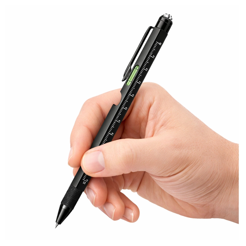 Črni svinčnik združuje LED svetilko, libelo, ravnilo, pisalo za dotik, odpirač za steklenice, držalo za telefon in izvijača (ploščati/križni). Odličen za hitre popravke, merjenje in zapiske.