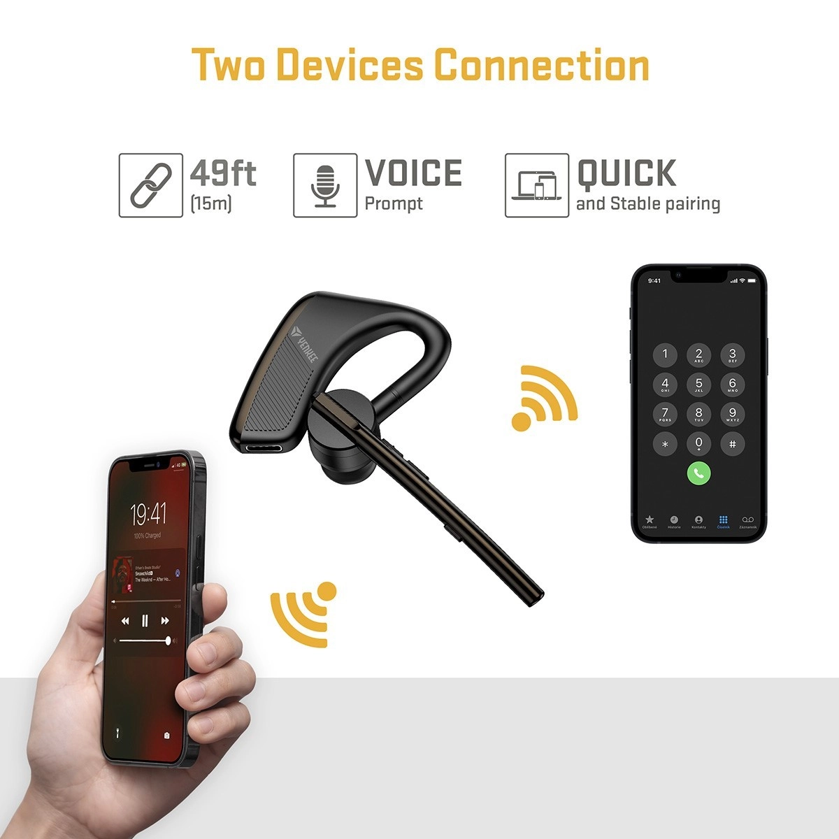 Slušalko lahko seznanite z dvema napravama hkrati, zato lahko sprejemate klic iz telefona in prenosnika brez preklapljanja. Je zanesljiva rešitev za varno telefoniranje med vožnjo in povsod, kjer potrebujete proste roke.