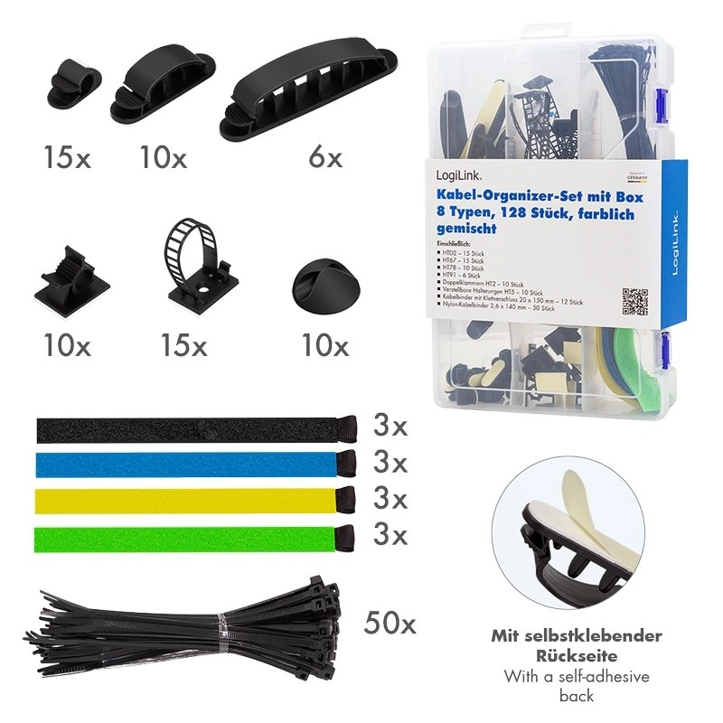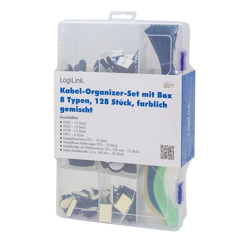 Praktičen komplet LogiLink za urejeno kabelsko napeljavo doma in v pisarni. Vsebuje 8 različnih elementov – vezice, sponke in držala za kable – shranjene v prozornem transportnem zaboju za enostavno prenašanje in shranjevanje.