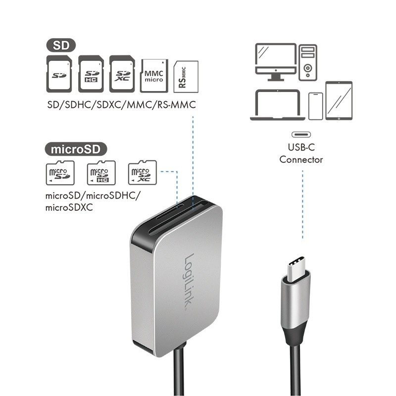 - SD, SDHC, SDXC, microSD, MMC, RS‑MMC