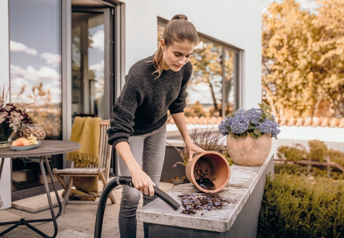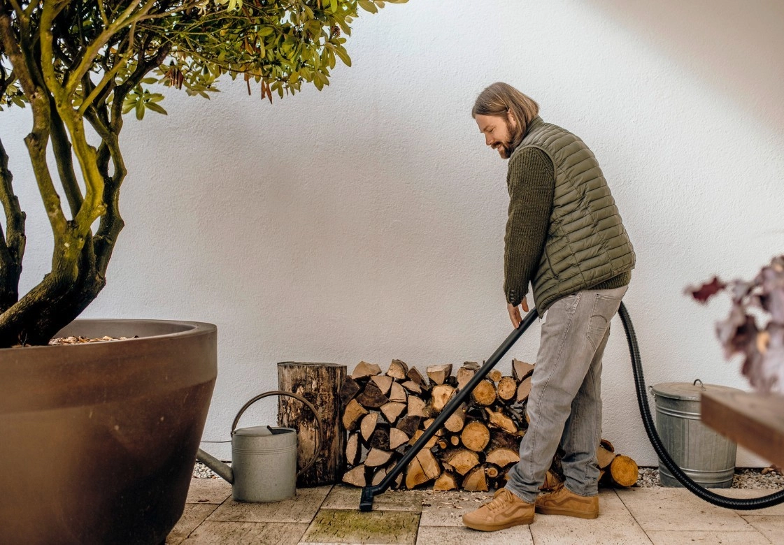 Kjer ni mogoče posesati, preprosto odpihnite: odstrani listje, prah in drobtine s teras, poti in fug. Idealno za hiter zunanjí čiščenje.