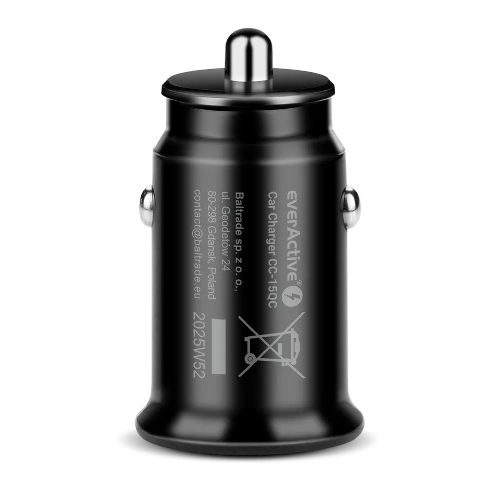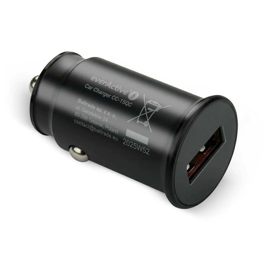 Uživajte v zanesljivem polnjenju na poti. Avtopolnilnik everActive za 12/24 V vtičnice ima en priključek USB‑A z Quick Charge 3.0 in zagotovi do 18 W moči za krajšanje časa polnjenja. Robusten in kompakten ohišje se udobno prilega v vtičnico za vžigalnik in ne ovira pri uporabi.