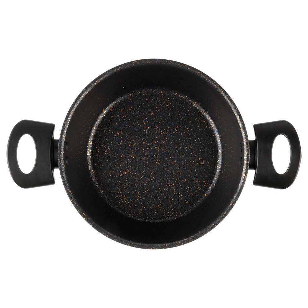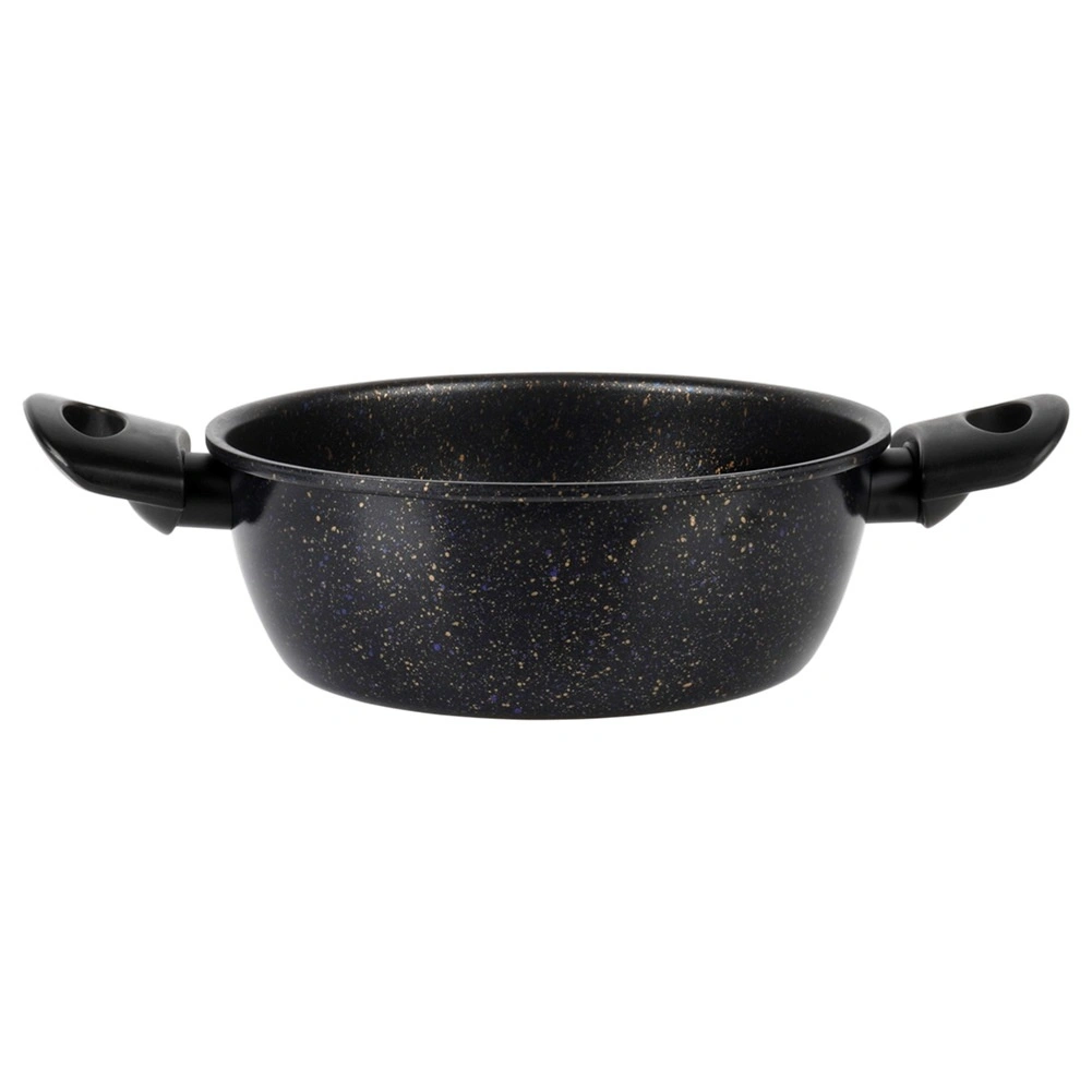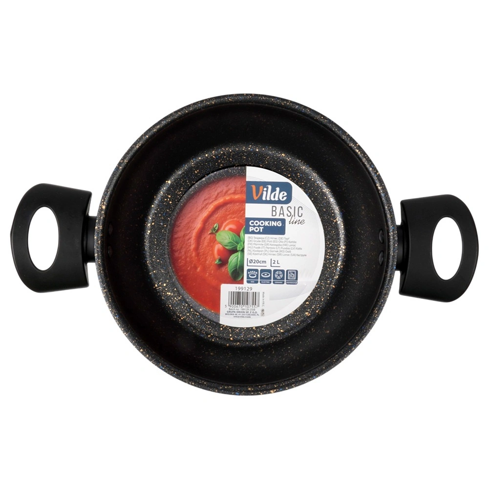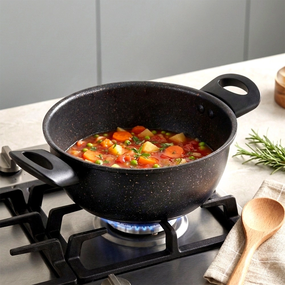 Praktičen granitni lonec s prostornino 2 l in premerom 20 cm z vzdržljivo nelepljivo površino za kuhanje z minimalno maščobo. Ergonomski široki ročaji zagotavljajo varno upravljanje, lonec je primeren za plinske, električne in steklokeramične štedilnike ter ga je možno pomivati v pomivalnem stroju (ni namenjen za indukcijo).