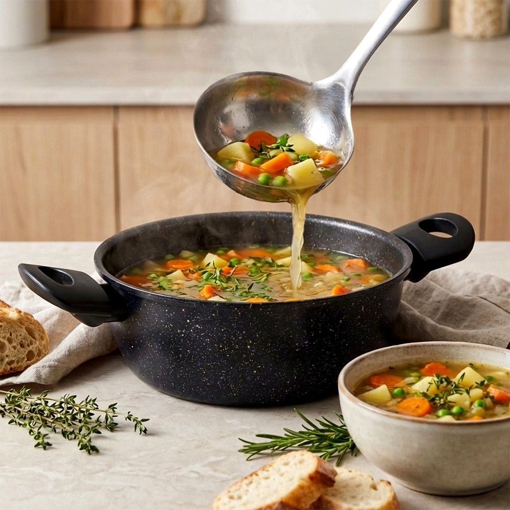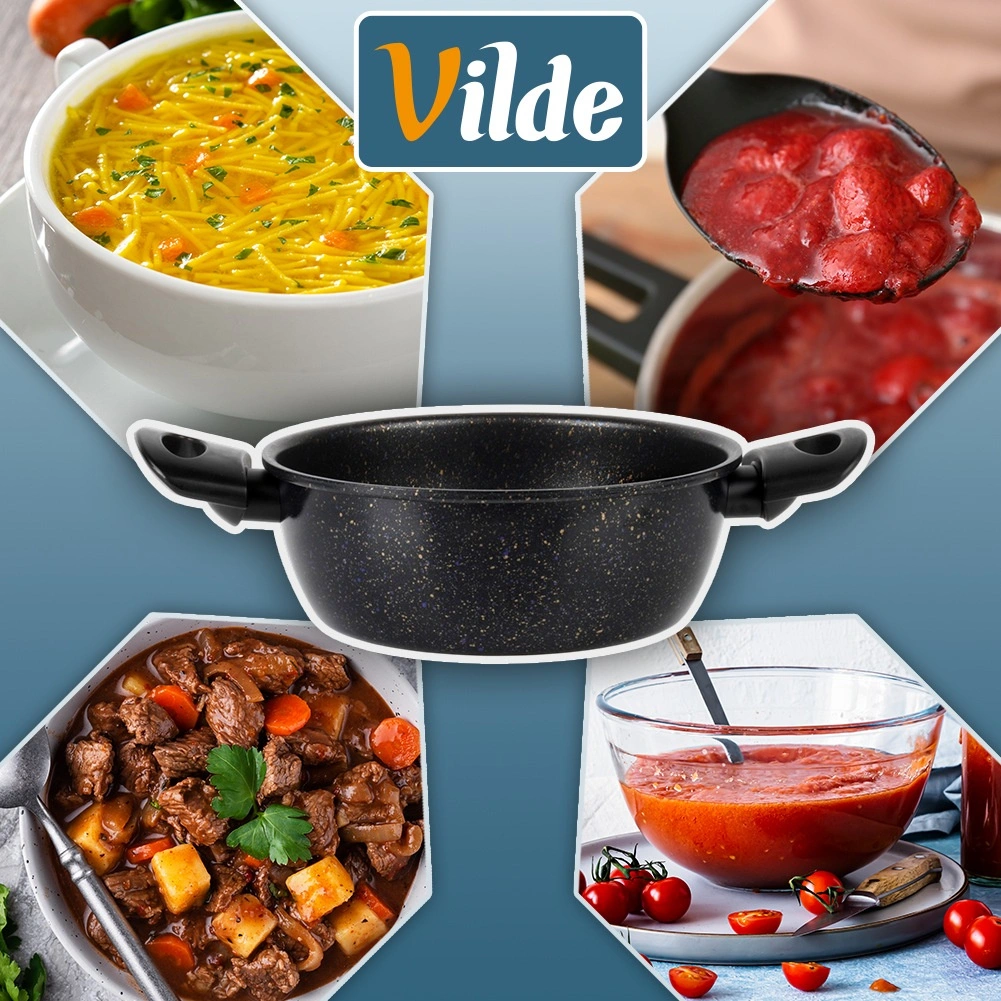 Univerzalni lonec iz linije Basic Line je izdelan iz trdnega ogljičnega jekla in opremljen z neprijemljivo granitno površinsko obdelavo za lahko izcejanje jedi in hitro čiščenje. Idealen za vsakodnevno kuhanje, dušenje in pogrevanje juh, omak, zelenjave in glavnih jedi.