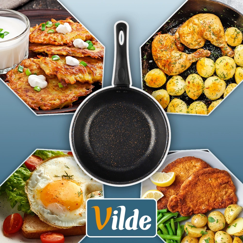 Stilska in vzdržljiva ponev s premerom 20 cm iz kolekcije VILDE Basic Line je idealna za vsakodnevno pečenje in dušenje. Neprijemljiva granitna površina omogoča kuhanje z minimalno količino olja, jedi se ne prijemajo in ponev se enostavno čisti — tudi v pomivalnem stroju.