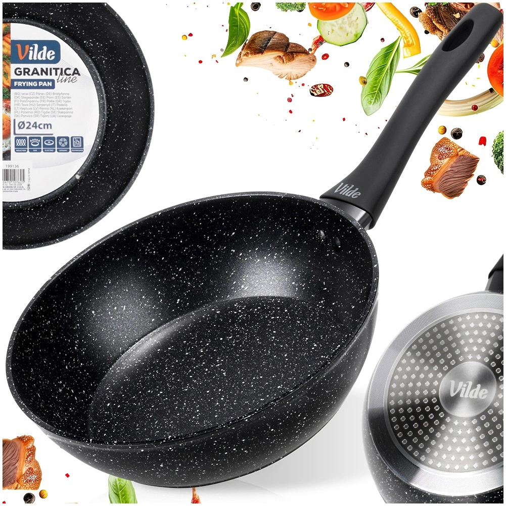 Granitna ponev GRANITICA 24 cm je zanesljiv pomočnik za cvrtje in dušenje. Telo iz litega aluminija z vzdržljivim neoprijemljivim granitnim premazom zagotavlja hiter prenos toplote, varčnost z energijo in enostavno sproščanje jedi brez prijemanja.