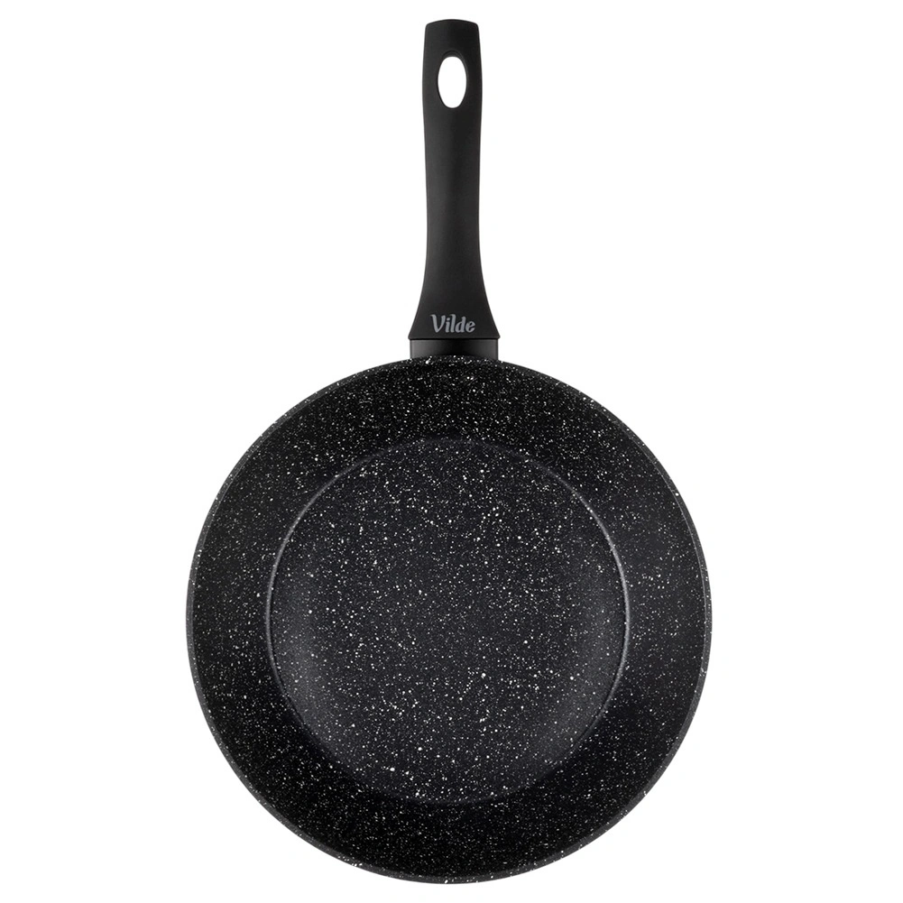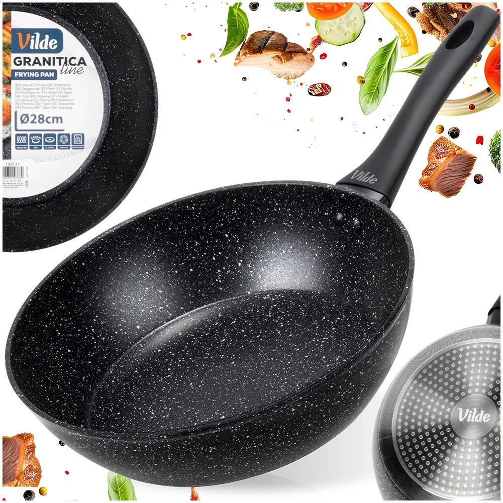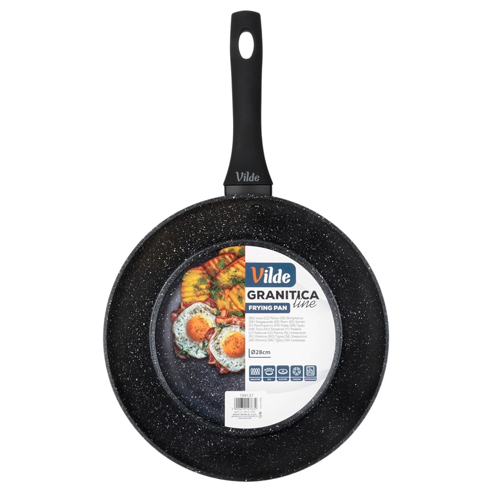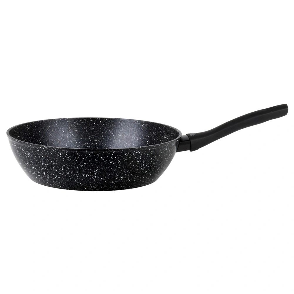 Praktična granitna ponev s premerom 28 cm za vsakodnevno kuhanje. Zahvaljujoč neprijemljivi granitni površini lahko pečete z minimalno količino maščobe, čvrsto aluminijasto ohišje zagotavlja hitro in enakomerno porazdelitev toplote. Ergonomski ročaj soft touch je udoben in varen, ponev je primerna za vse vrste štedilnikov, vključno z indukcijo in jo je možno pomivati v pomivalnem stroju.