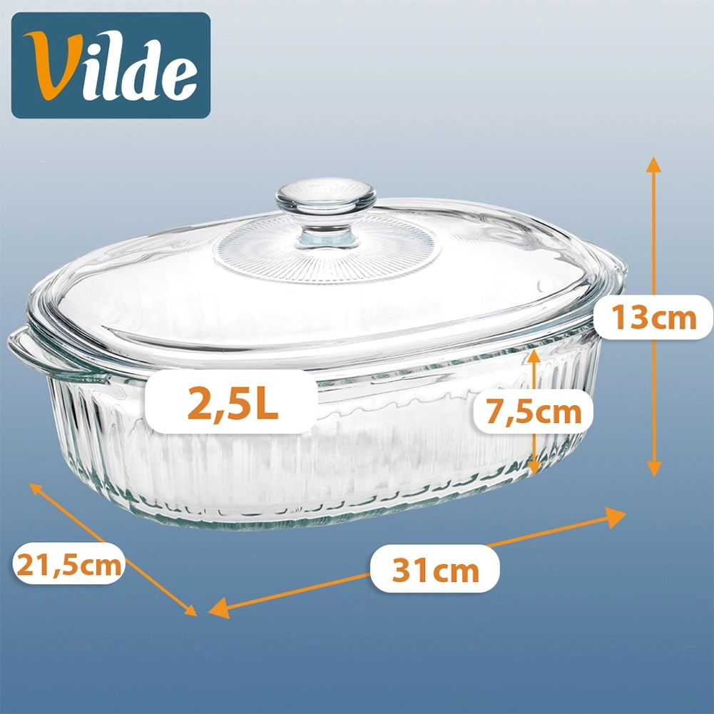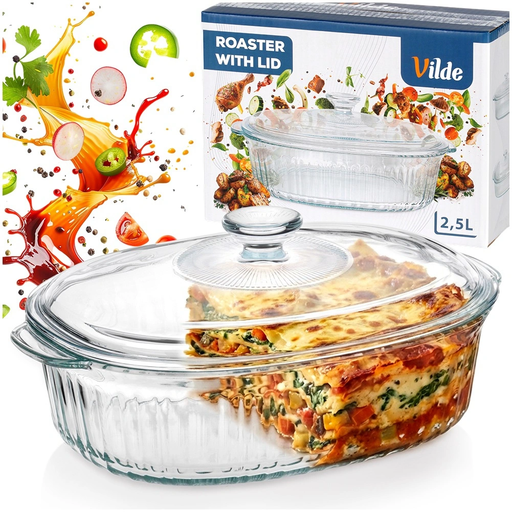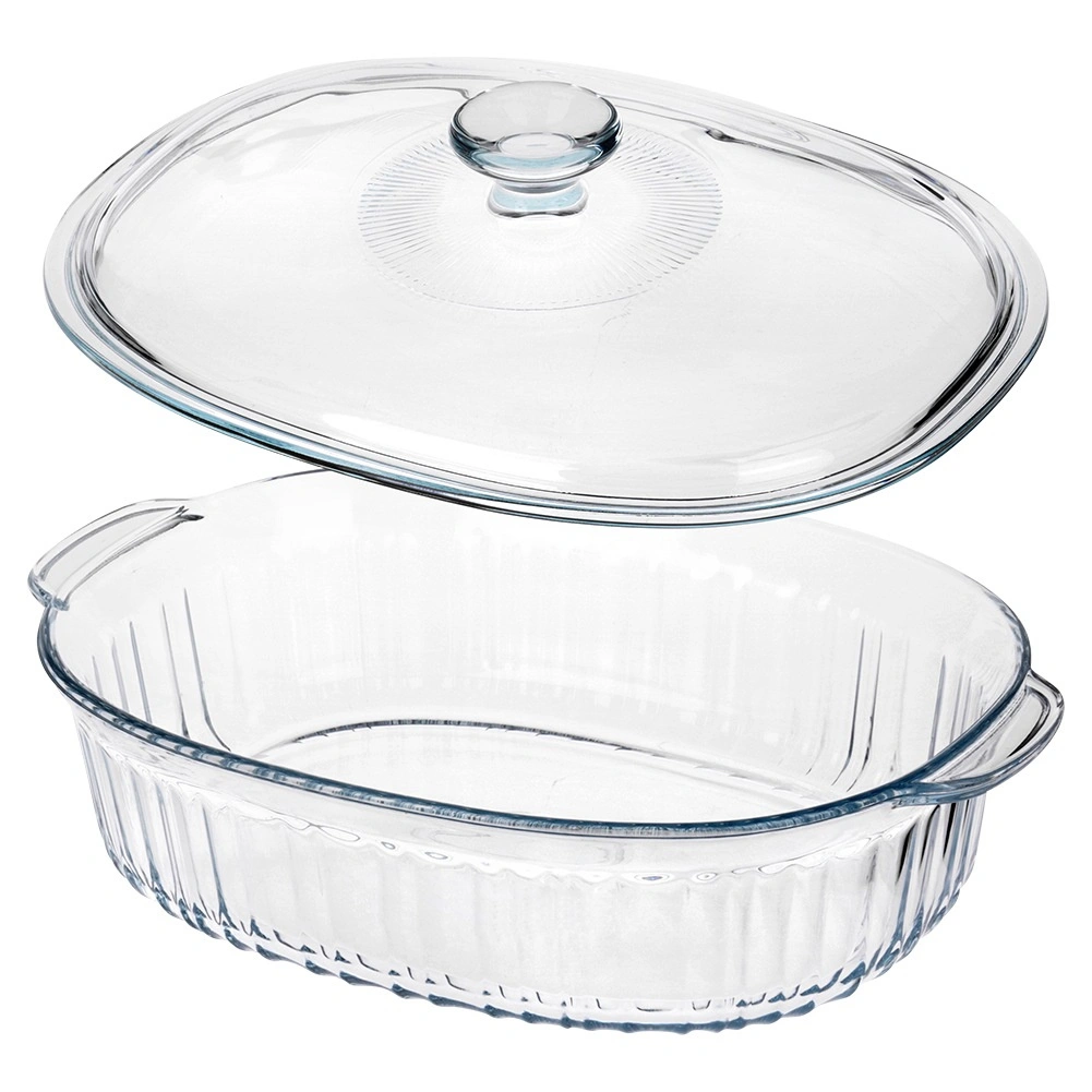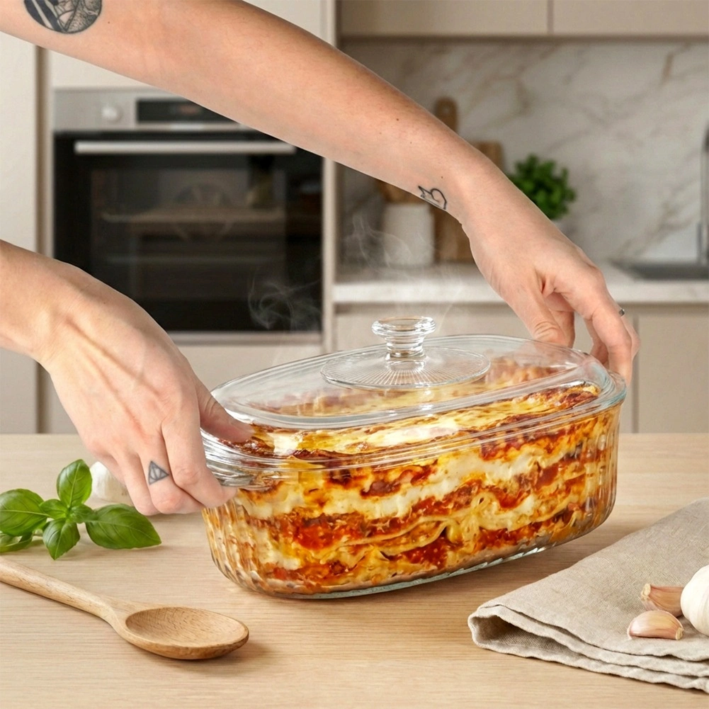 Univerzalna ognjevzdržna posoda za vsakodnevno peko in serviranje. Ovalna oblika z dekorativnim rebrastim vzorcem izgleda odlično na mizi, prozorno steklo pa omogoča nadzor stopnje zapečenosti. Pokrov pomaga ohranjati vlago in toploto, da meso, lazanja ali zelenjava ostanejo popolno sočni.