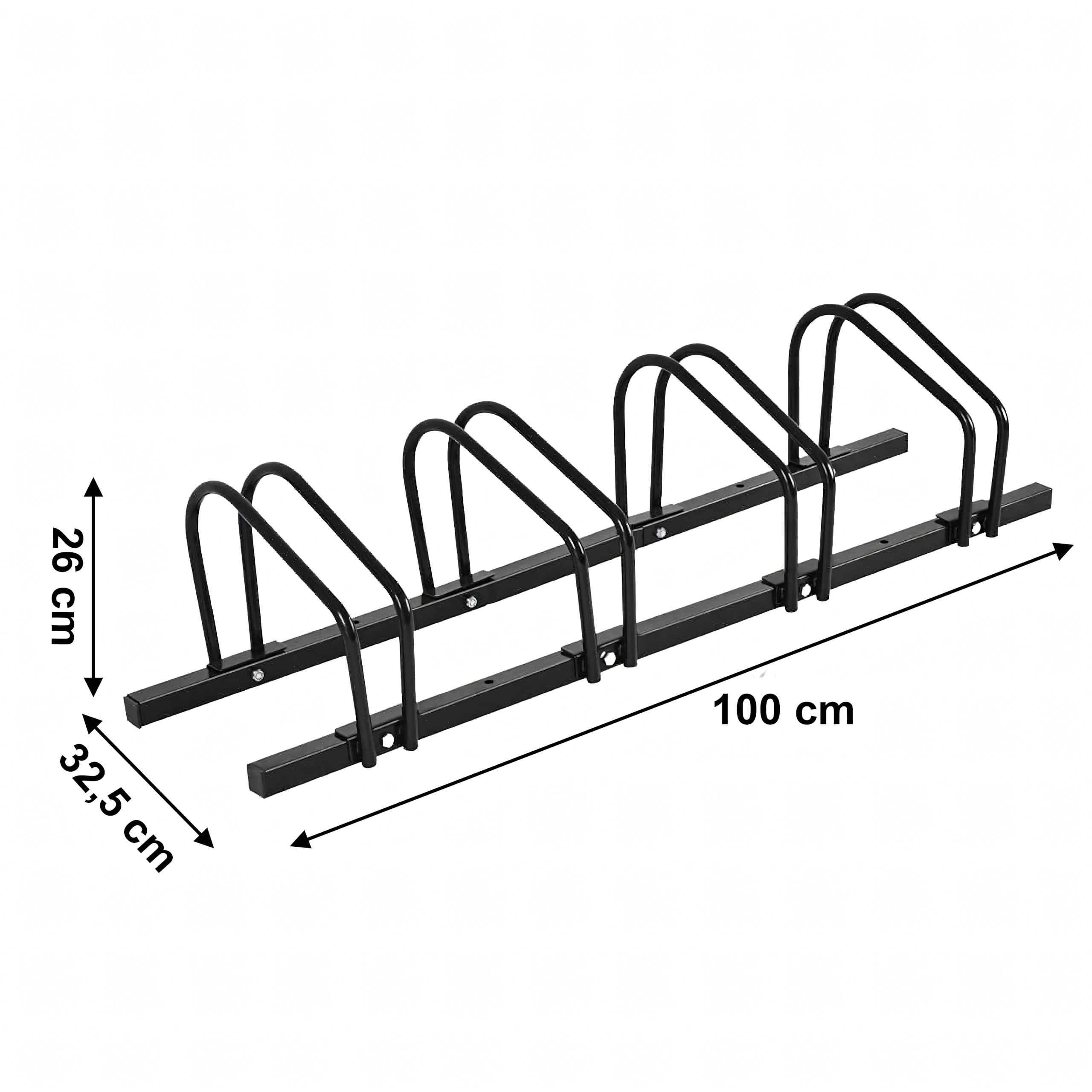 To robustno stojalo za kolesa sprejme do štiri kolesa in jih varno drži v navpičnem položaju. Jeklena konstrukcija z odporno površino zagotavlja dolgo življenjsko dobo in stabilnost pri vsakodnevni uporabi. Zaradi kompaktnih mer 100 × 32,5 × 26 cm je primerno za garažo, klet, teraso in poslovne prostore.