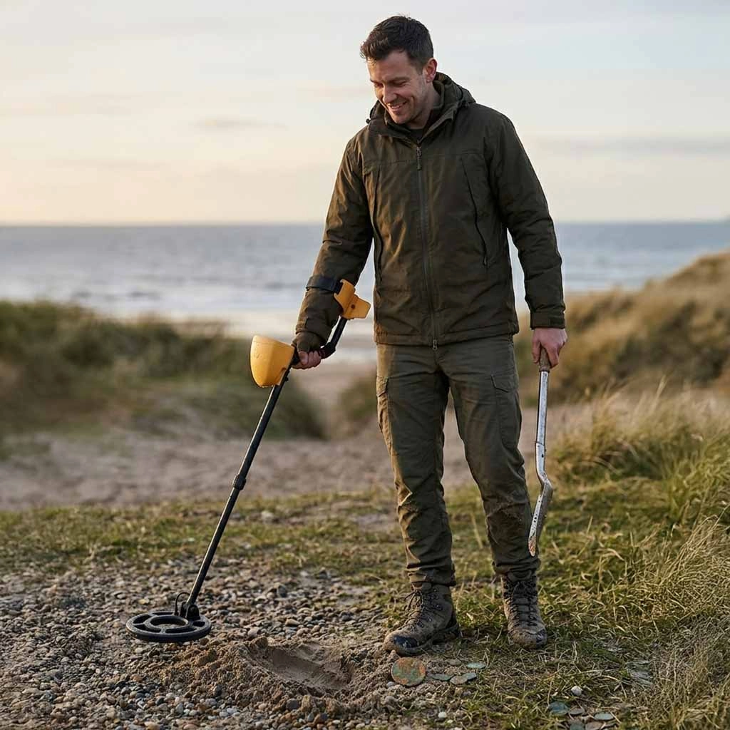 Univerzalni detektor kovin z osvetljenim LCD-zaslonom, samodejno identifikacijo ciljev in vodoodpornim tuljavnim senzorjem za iskanje na terenu in v plitvi vodi. Ponuja izločanje neželenih kovin, nastavljivo občutljivost, tonsko signalizacijo in ergonomski naslon za podlaket za udobno in natančno iskanje.