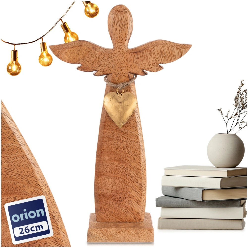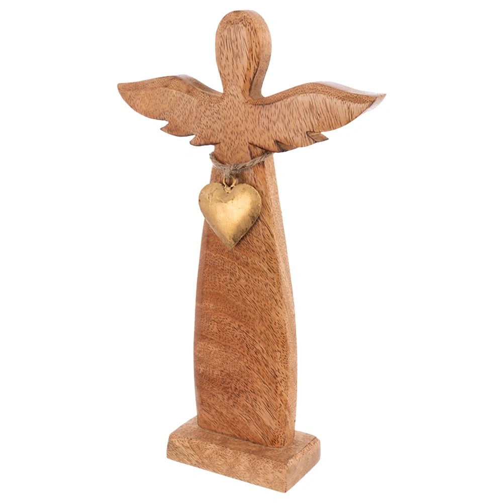 Elegantna lesena figurica angela iz naravnega mangovega lesa z nežno izrezanimi krili in visečim srcem v zlati barvi vnese v interier naravni čar in prijetno vzdušje. Stilska dekoracija za polico, komodo ali mizo, idealna tudi kot izvirno darilo za posebne priložnosti.