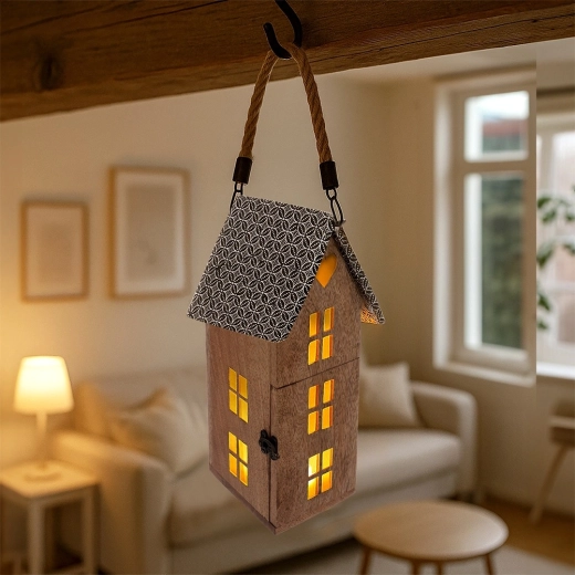 Praktičen odstranljiv vrvni ročaj omogoča enostavno prenašanje in obešanje. Lampijon lahko postavite na komodo, polico ali okensko polico, ali pa ga obesite za še bolj izrazite svetlobne učinke skozi okenca hiške. Odličen kot celoletna dekoracija in sezonski poudarek za praznike ter večerne trenutke.