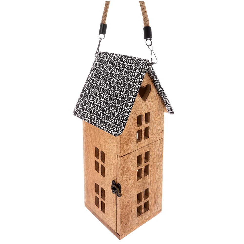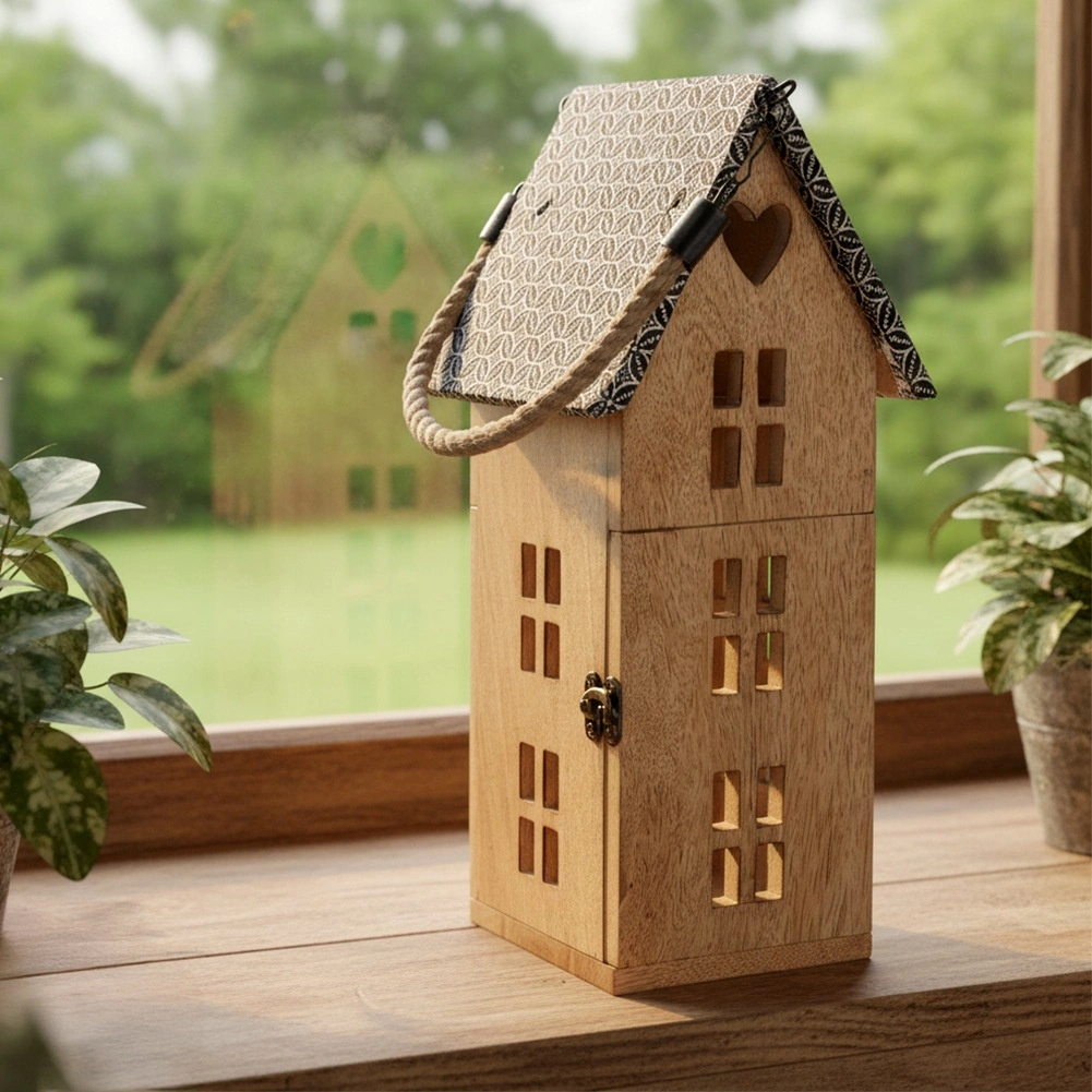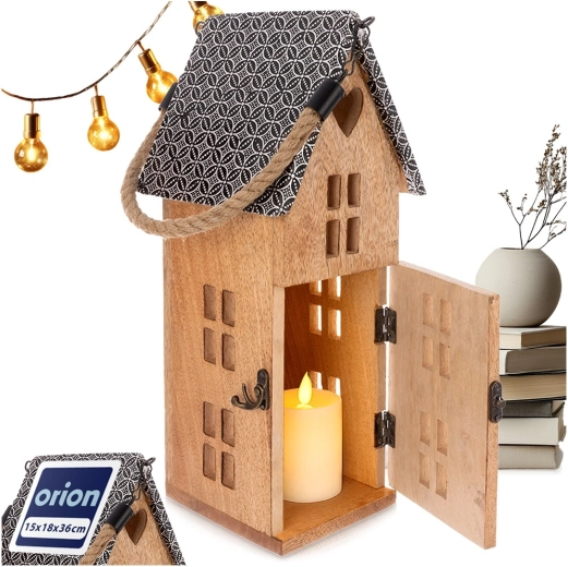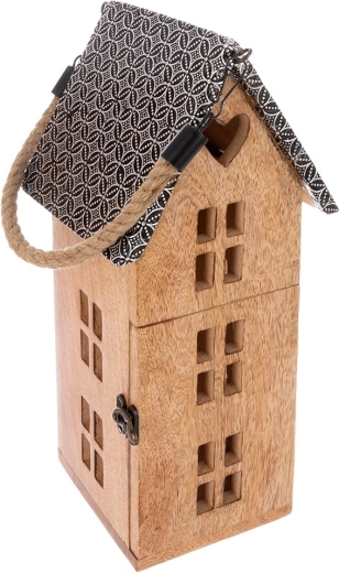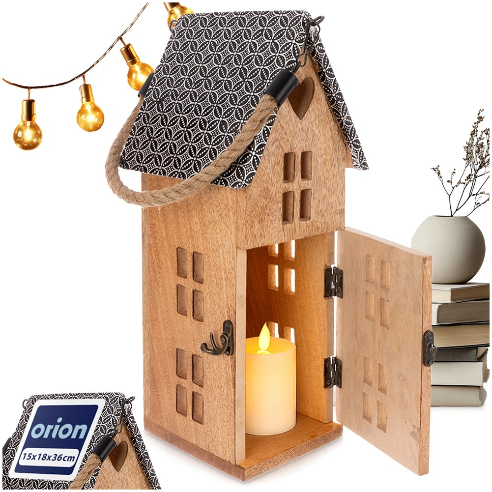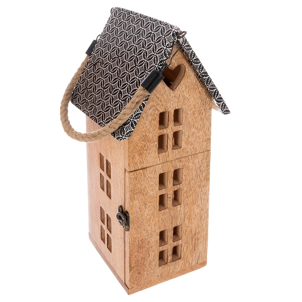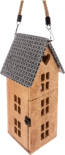Stilski lampijon v obliki hiške iz trpežnega mangovega lesa prinaša prijetno ambientalno svetlobo za vsak interier in teraso. Zahvaljujoč varni LED sveči, močanemu vrvnemu ročaju ter možnosti obešanja ali postavitve je odličen dekorativni dodatek. Kovinska streha in naravni videz lesa poudarjata rustikalno eleganco.