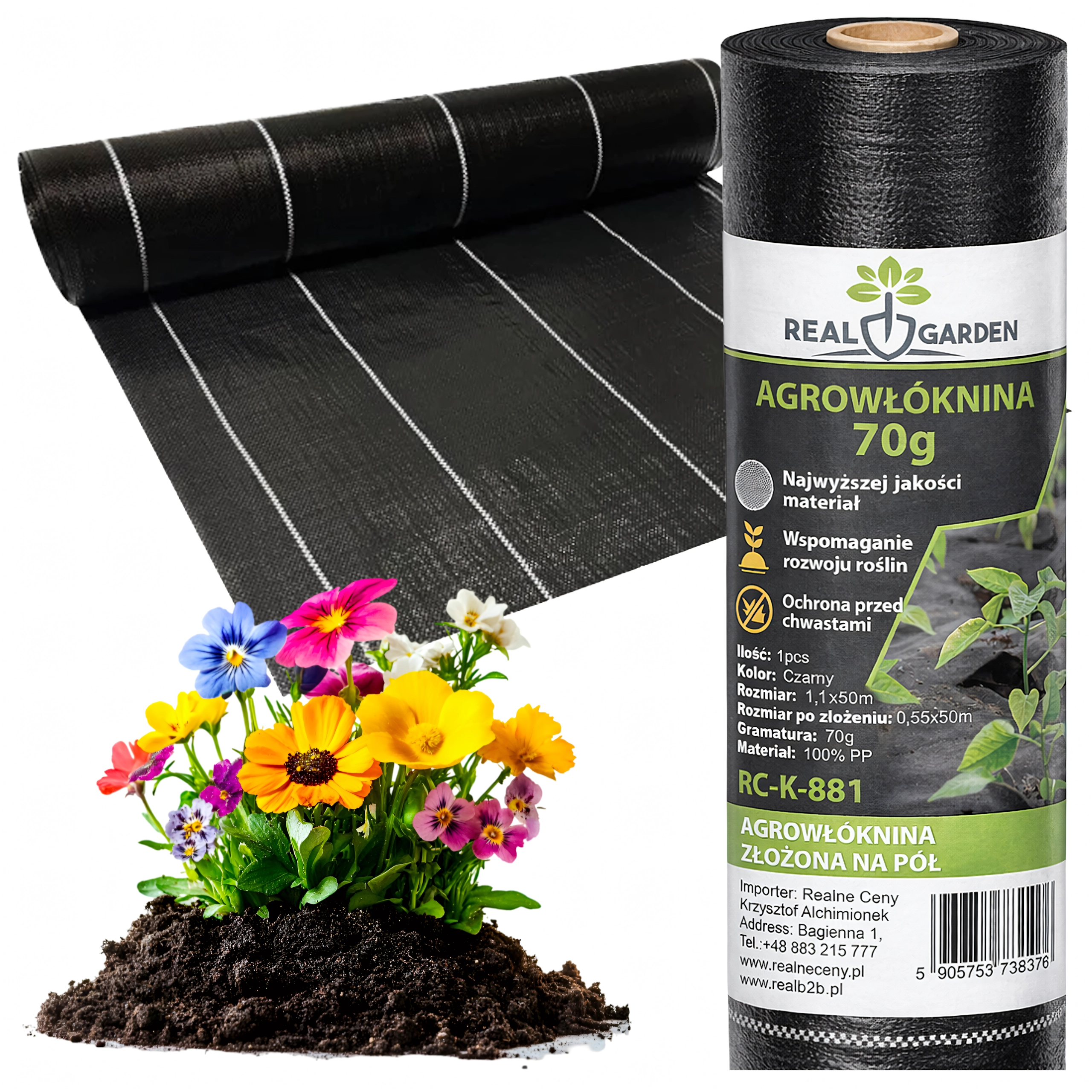 Rola je dobavljena zložena na polovico za lažje rokovanje (širina zložene role 55 cm, po razgrnitvi 110 cm). Material je UV stabiliziran za dolgo življenjsko dobo na soncu in odporen proti trganju. Primerno pod mulčevalno lubje, dekorativni kamen ter kot podlaga za gojitvene posode.