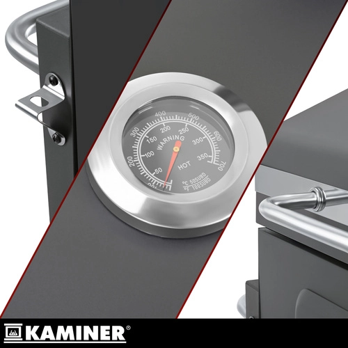 Odkrijte vzdržljiv žar na oglje KAMINER, ki zaradi debele pločevine (1 mm) dlje zadržuje toploto in se ne deformira. Litoželezna 3-delna rešetka (emajl) nudi zanesljivo oporo za meso, sredinska odprtina pa olajša upravljanje in čiščenje. Pokrov z vgrajenim termometrom in sistem zračnikov z dimnikom omogoča natančen nadzor temperature brez nepotrebnega dvigovanja pokrova.
