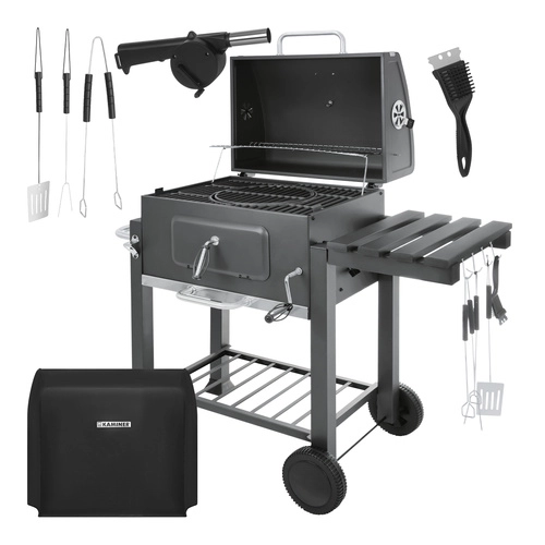S mehanizmom z ročnim kolescem zlahka dvignete ali spustite kurišče in prilagodite žar brez premikanja hrane. Posoda za oglje iz nerjavnega jekla prenese višje temperature in čiščenje, izvlečna posoda za pepel pa pospeši vzdrževanje. Praktična stranska mizica, spodnja polica in kljukice držijo pripomočke pri roki. V paketu prejmete tudi pregrinjalo, komplet BBQ pripomočkov, ročni meh in čistilno krtačo – dodajte le oglje in že lahko pečete.