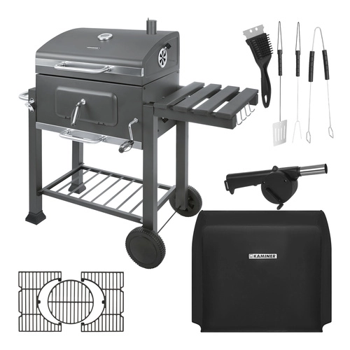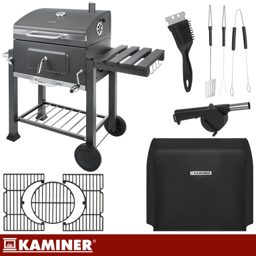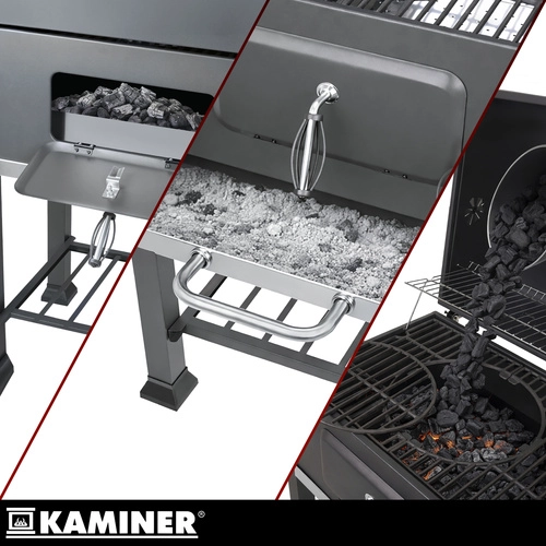 Robusten vrtni žar KAMINER za zahtevno peko na žaru: litoželezna, 3-delna emajlirana rešetka s sredinsko odprtino, pokrov s termometrom, nastavitev višine kurišča z ročnim kolescem in posoda za oglje iz nerjavnega jekla za stabilno temperaturo in enostavno čiščenje. Paket dopolnjuje kromirana zgornja rešetka – warm rack, stranska mizica, posoda za pepel ter bogata dodatna oprema vključno z zaščitnim pregrinjalom.
