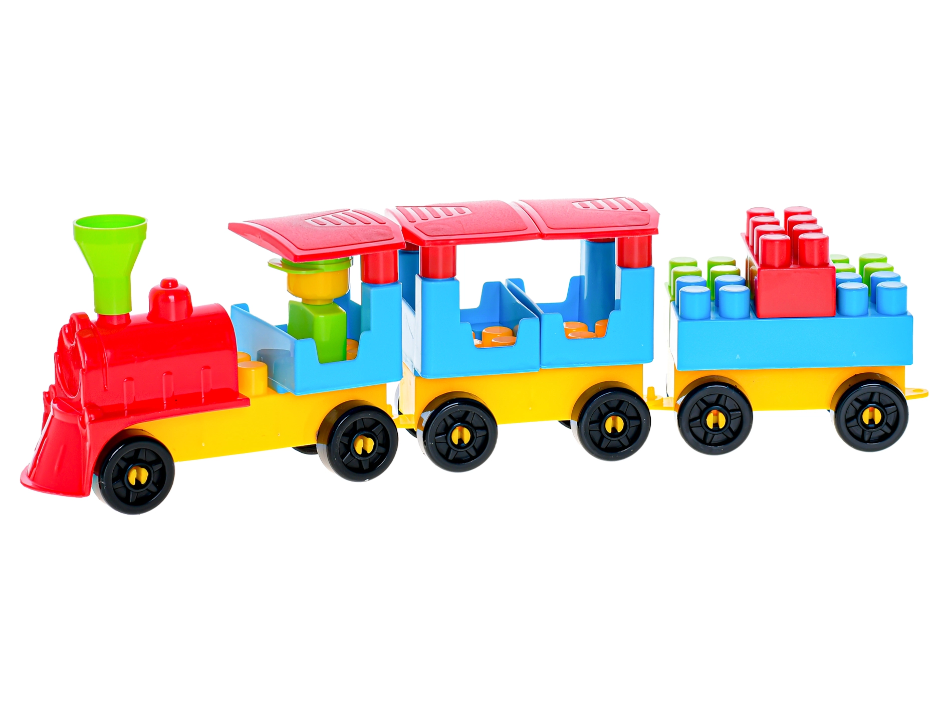 Preprost sistem povezovanja kosov otrokom omogoča, da brez pomoči odraslih sestavijo lokomotivo in dva vagona ter doživijo veselje ob končanem projektu.