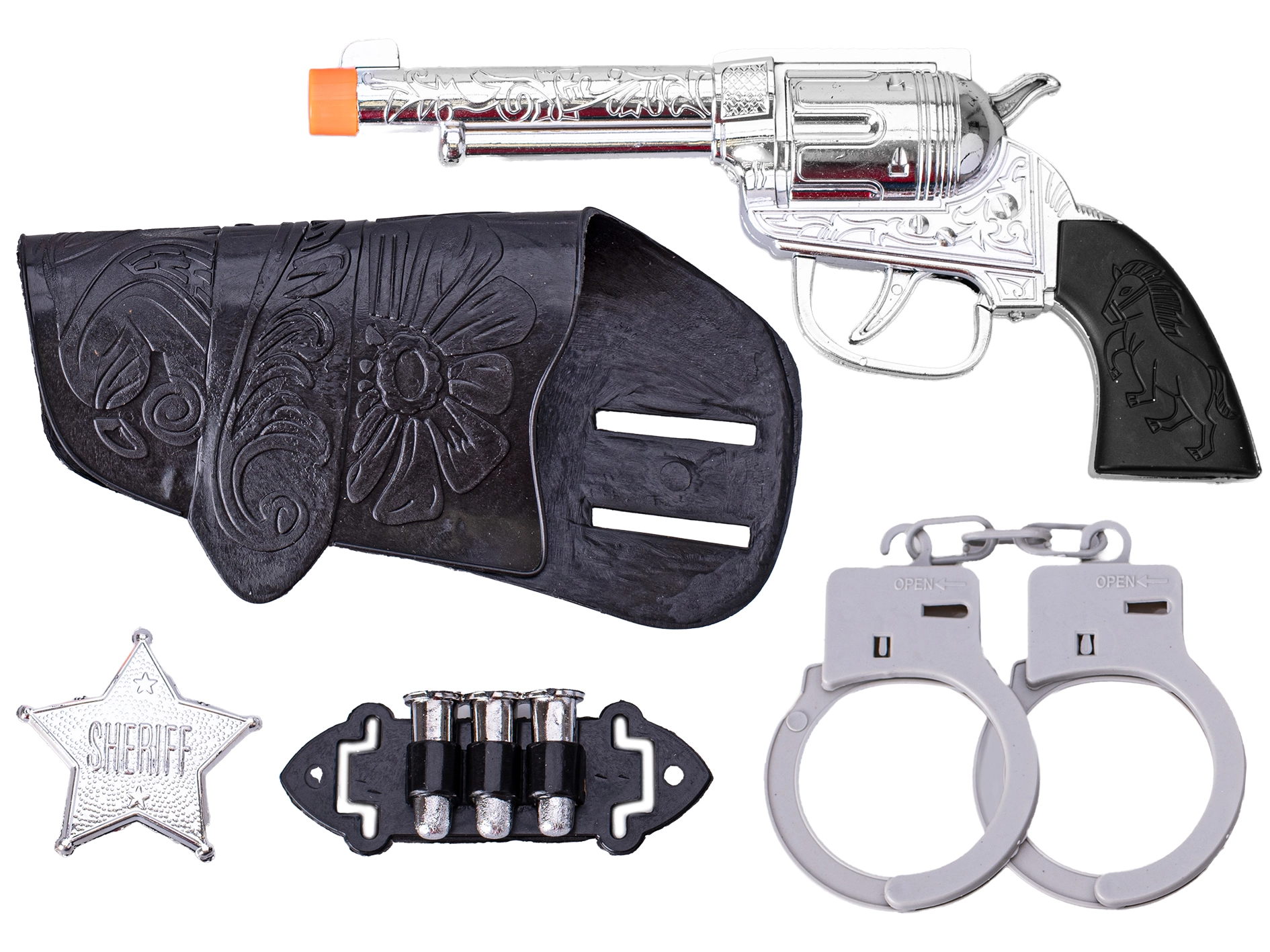 - Avtentična oprema: kolt, tok, lisice in šerifska zvezda za realistično vlogo šerifa.