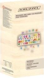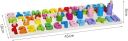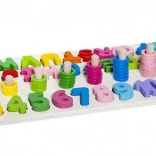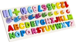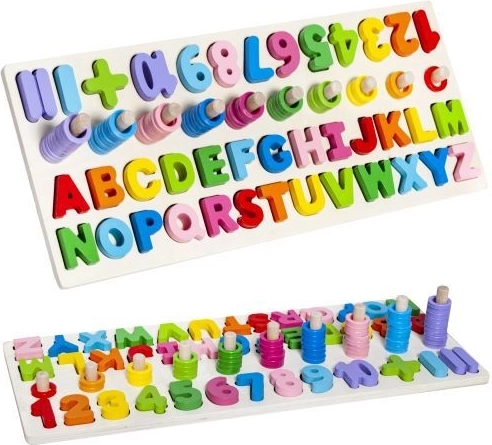 Ta večnamenska lesena sestavljanka združuje zabavo in učenje v enem. Otroci med igro spoznavajo oblike črk in številk, se jih učijo poimenovati, sestavljajo prve preproste besede ter vadijo štetje s pomočjo obročkov na količkih. Žive barve spodbujajo raziskovanje ter podpirajo ustvarjalnost in zbranost.