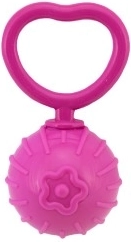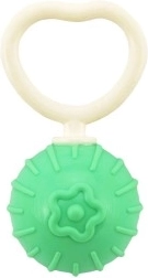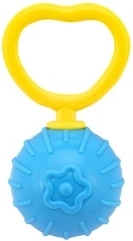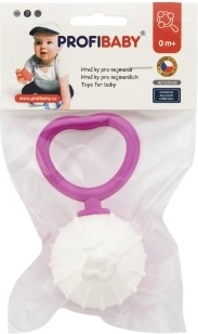 Ropotuljica meri približno 18 cm, kroglica ima premer 5 cm – idealna velikost za udoben oprijem. Dvobarvna izvedba v barvnem miksu pritegne pozornost in podpira zaznavanje kontrastov. Primerno za otroke od rojstva.