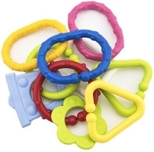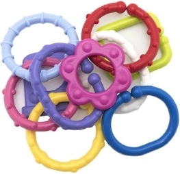 Ta komplet barvitih plastičnih oblik je idealna prva igrača za dojenčke. Koščki se med seboj zlahka zaskočijo in trdno držijo, zato si otroci lahko znova in znova sestavljajo verižice in preproste konstrukcije. Različne teksture in barve nudijo bogato senzorično stimulacijo, ropotanje pa otroke pritegne in pomiri.