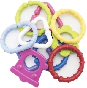 Igrača je izdelana iz trpežne in lahke plastike, ki jo je udobno držati v malih rokicah. Podpira naravni razvoj prijema, koordinacije oko–roka ter zgodnje zaznavanje oblik in barv. Koščke lahko uporabljate doma ali na poti – enostavno se čistijo in dolgo zdržijo.